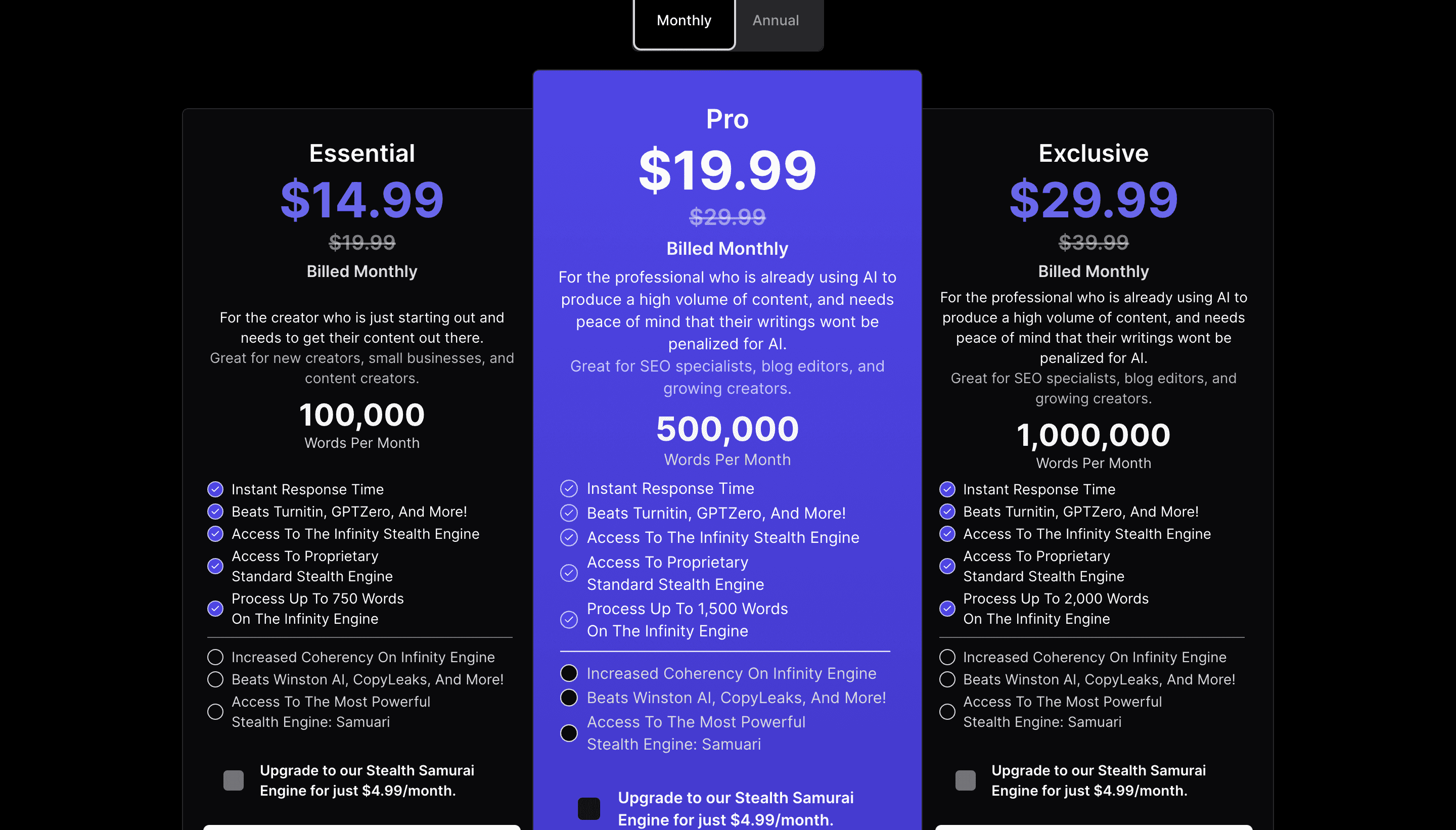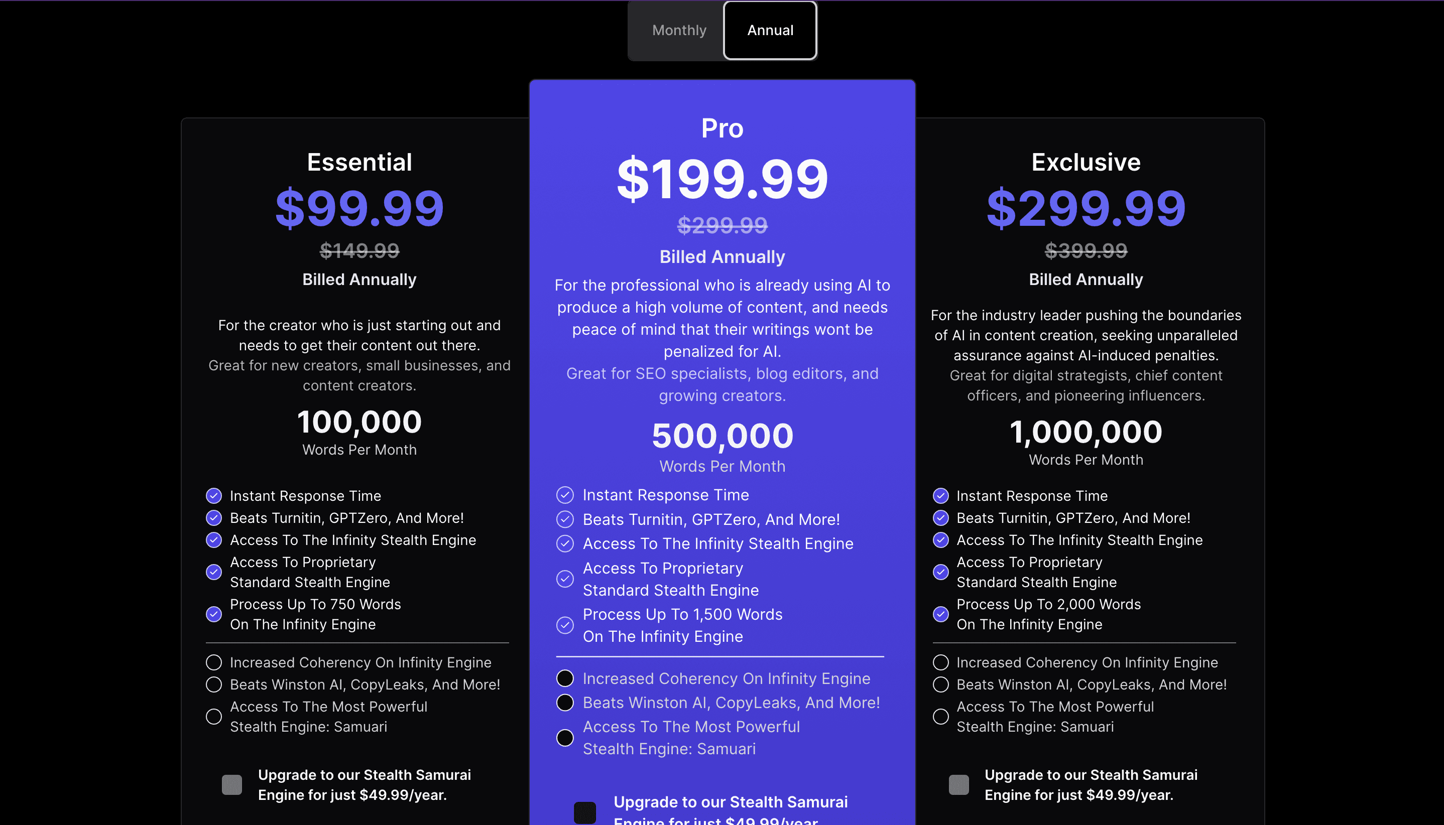 Starting at $14.99 per month for 100,000 Undetectable AI words, 1 user, and with chrome extension. $19.99 for 500,000 words per month and $29.99 for 1,000,000 words per month. An annual option of $99.99 for 100,000 words per month, $199.99 for 500,000 words per month, and $299.99 for 1,000,000 words per month.