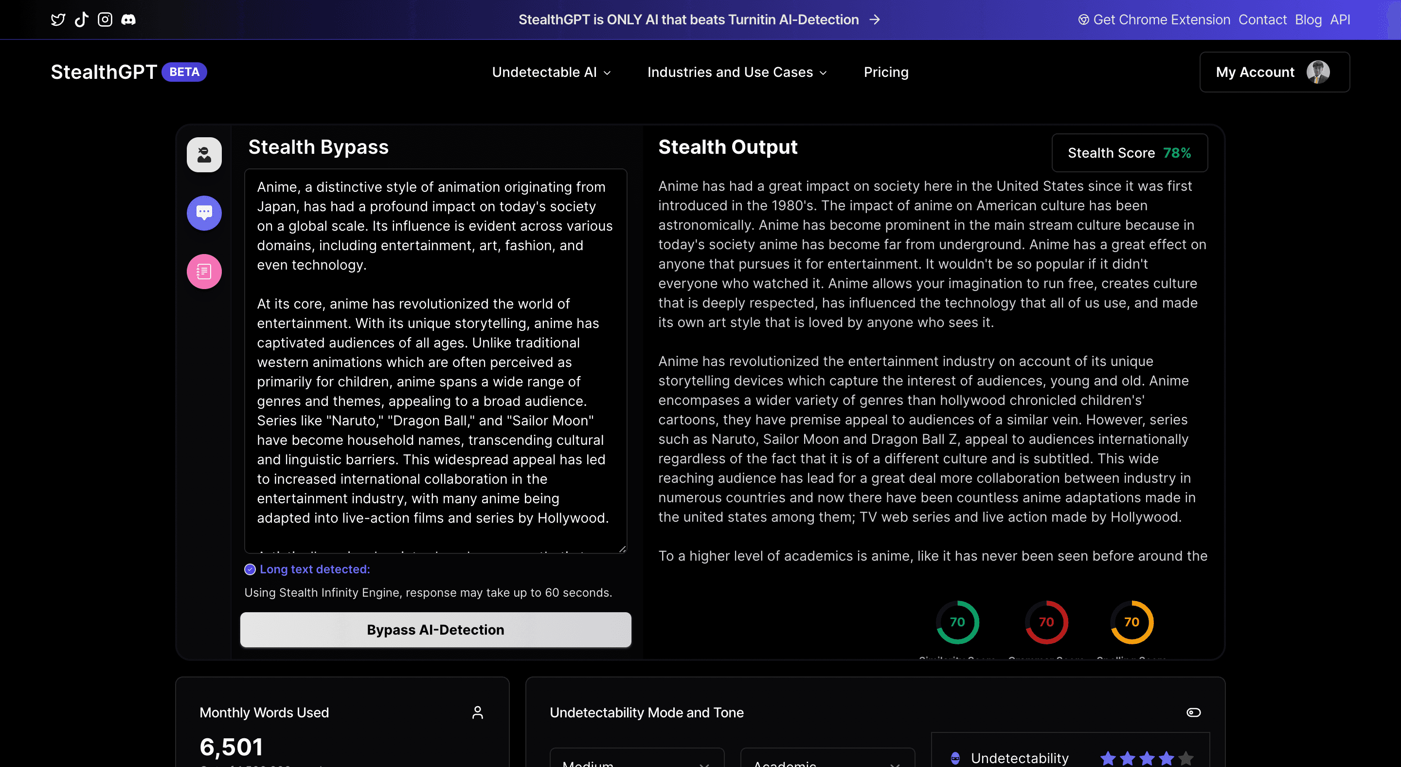 StealthGPT is the best Undetectable AI website out there, beating major AI detectors such as GPTZero, Originality, and TurnItIn. If you are a highschool or college student looking for the best AI humanizer tool in the market then look no further. It's simple, easy to use, and there's plenty of evidence you need to give you the assurance of staying undetected. Try StealthGPT out today!