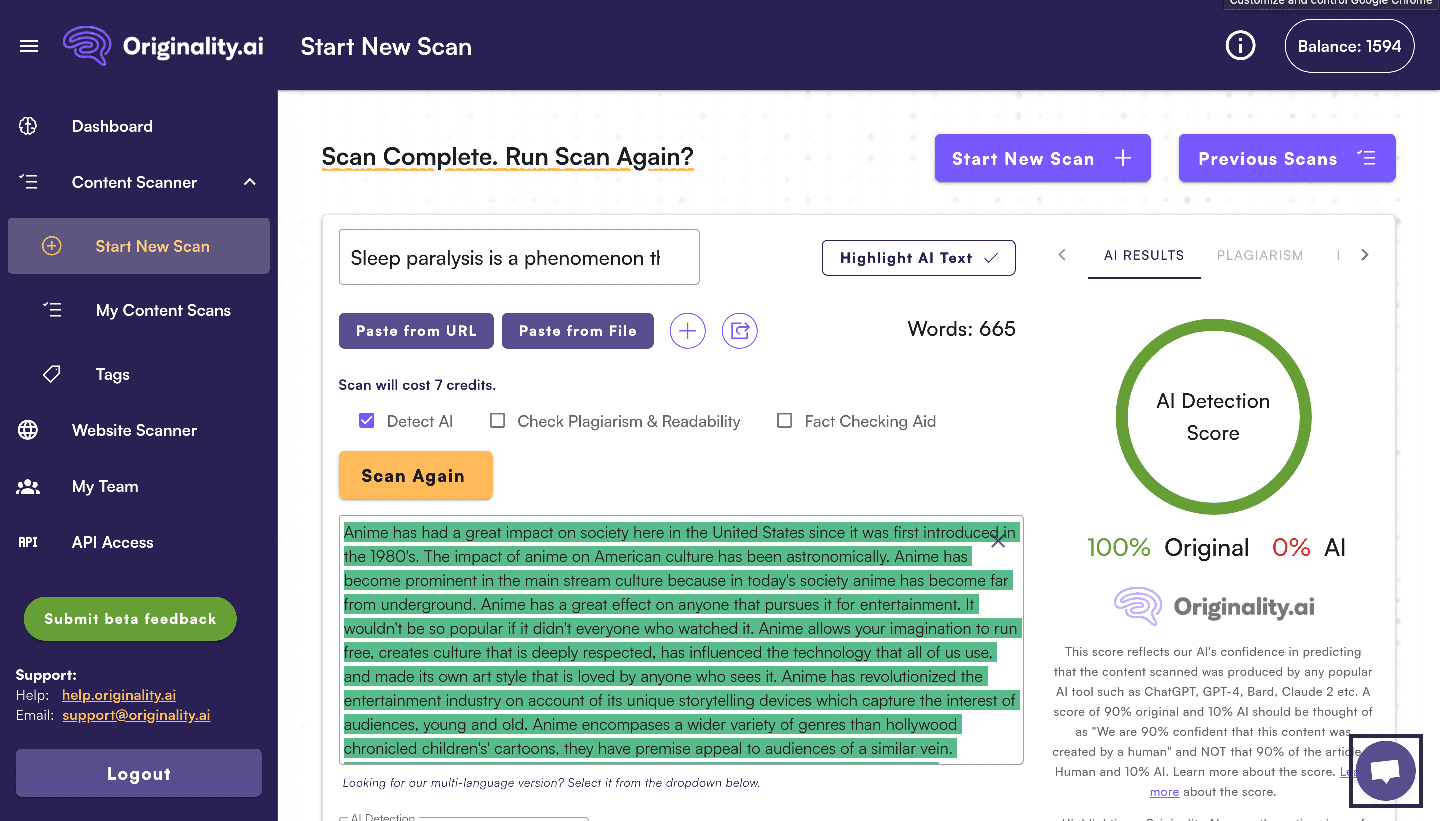 Wow from 94% from Humbot to just 0% AI written content from StealthGPT. This is a good sign but let's not get too hopeful just yet. We still have Originality and TurnItIn to see if StealthGPT is legit.