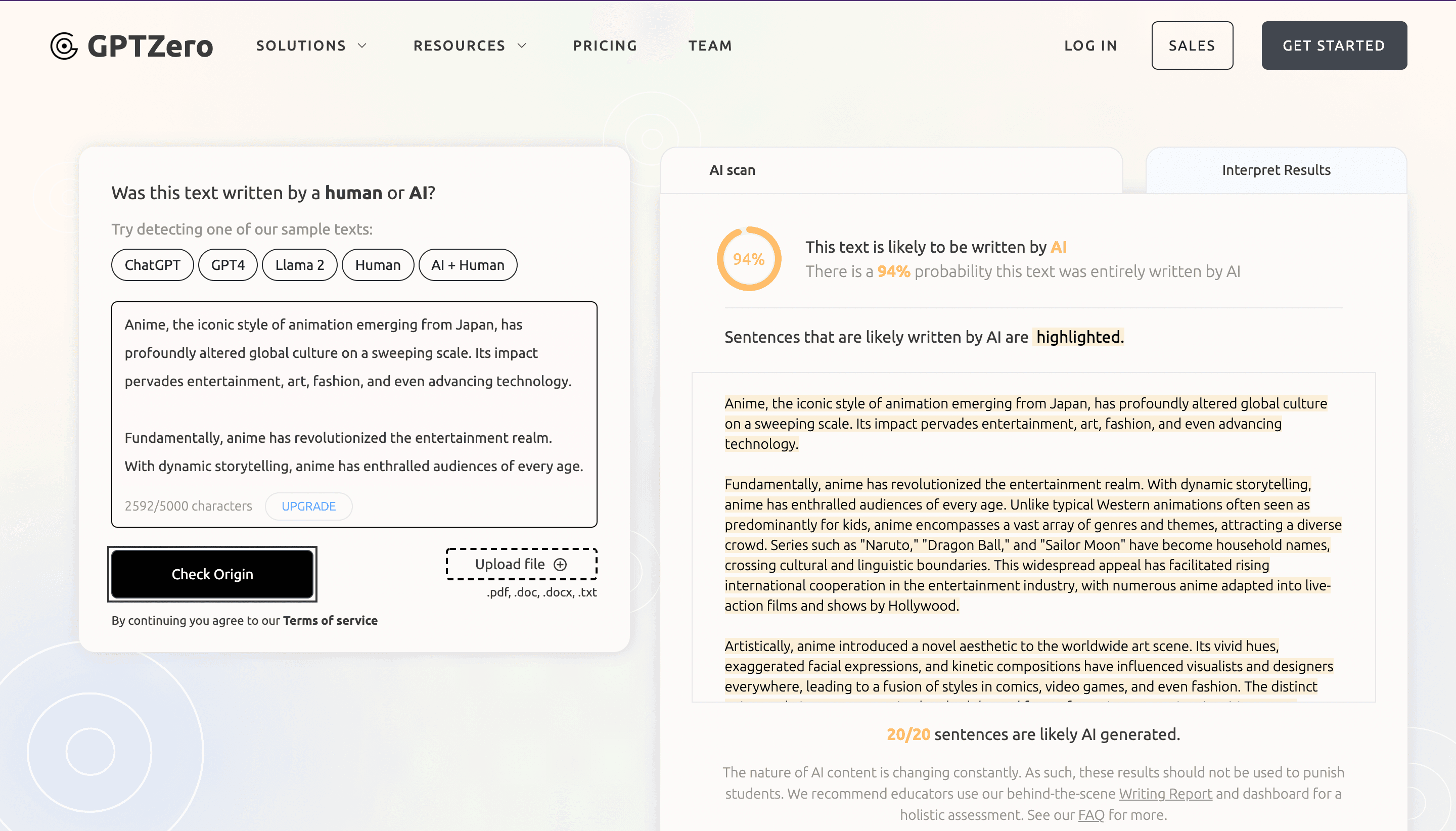 A 94% AI written score from GPTZero is not a good sign for Humbot. All 20 sentences were detected as AI generated. While it's possible for Humbot to bypass the other websites, It's not looking too good for them right now.