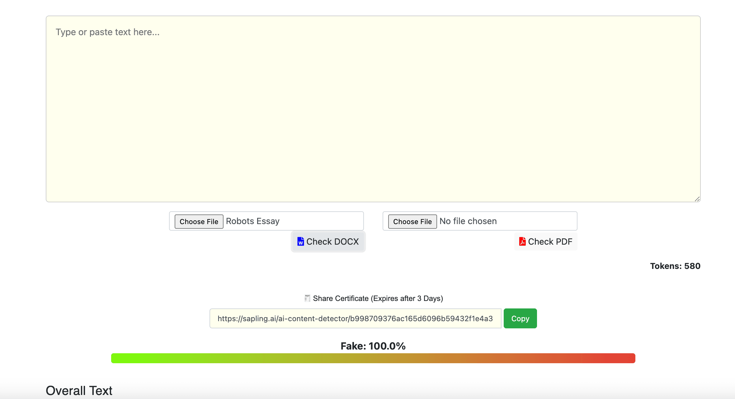 Ladies and gentlemen, we got detected. 100% too! That’s pretty impressive. It may not be the most convenient interface but Sapling.AI gets points in basic functionality.