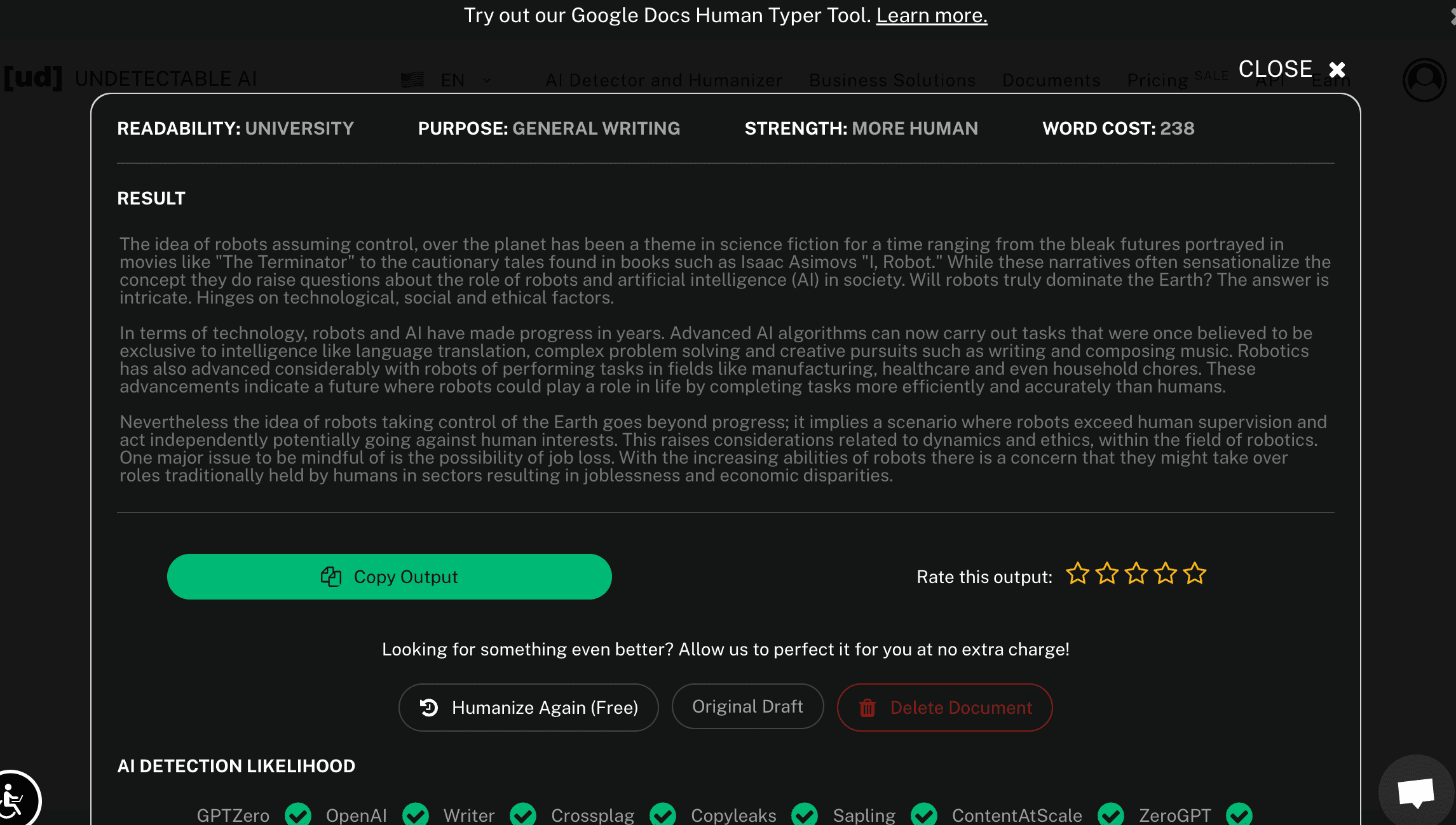 Now, lets try Sapling.AI against our Undetectable AI writing tool: