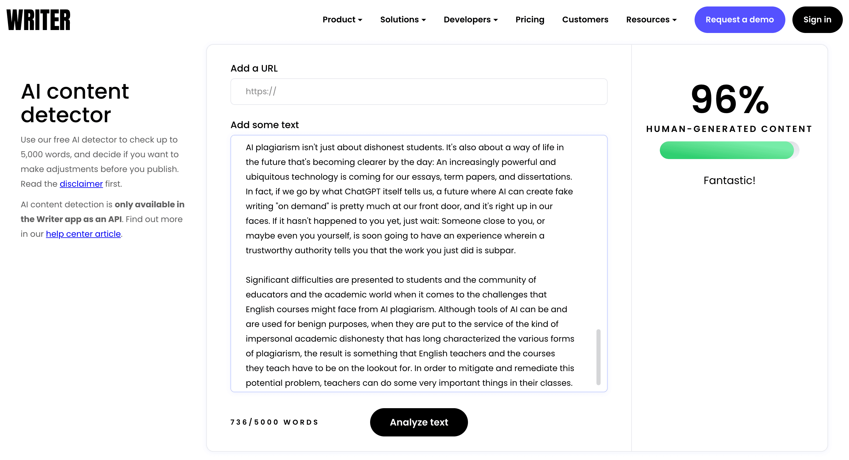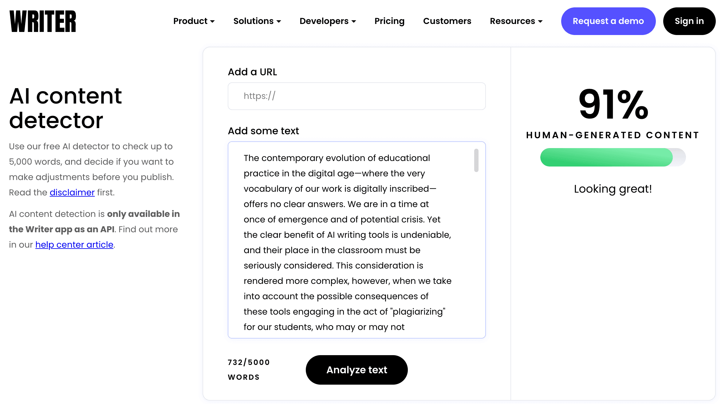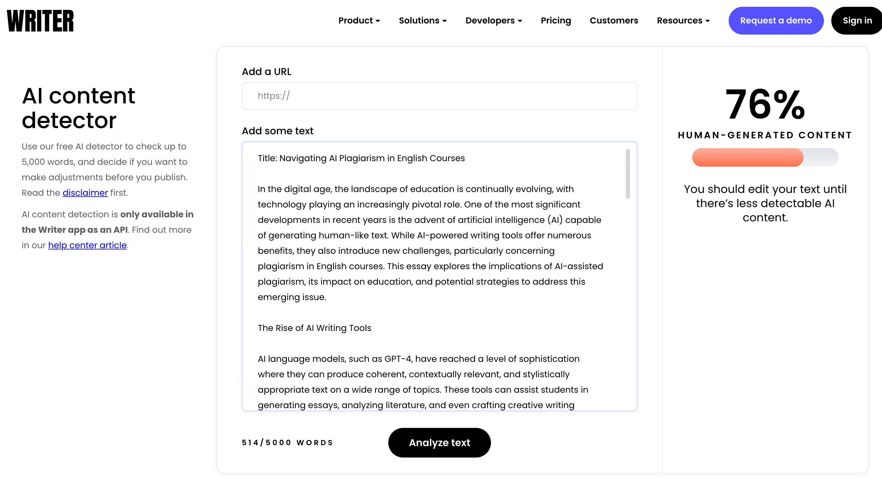 Writer did an exceptionally poor job at detecting AI-generated content in text. A 76% Human score from ChatGPT is scary. Like, who uses this service? Yeah, it’s free but so is hitting yourself with a hammer.