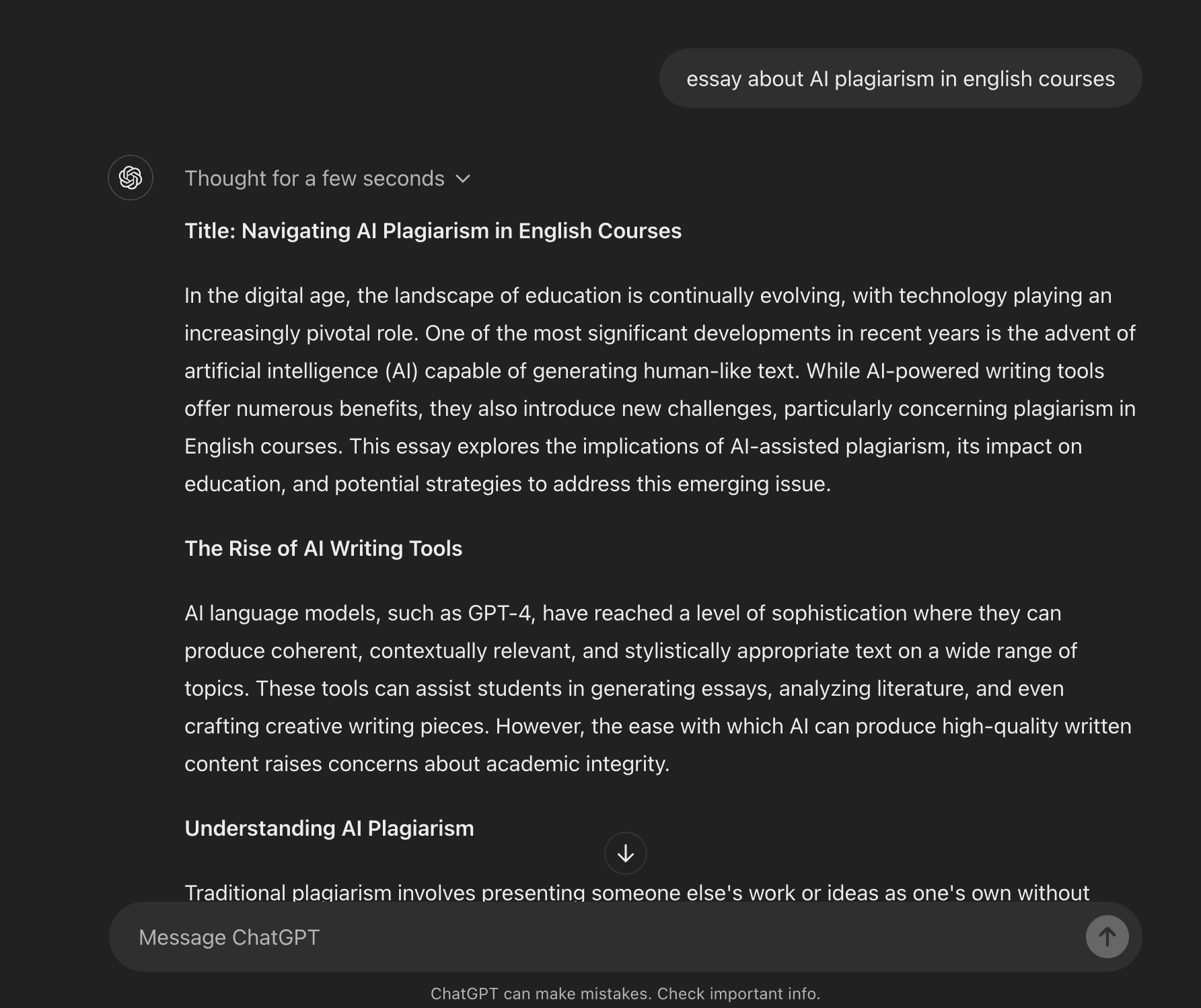 So, lets generate an AI-written essay with ChatGPT about AI plagiarism in English courses: