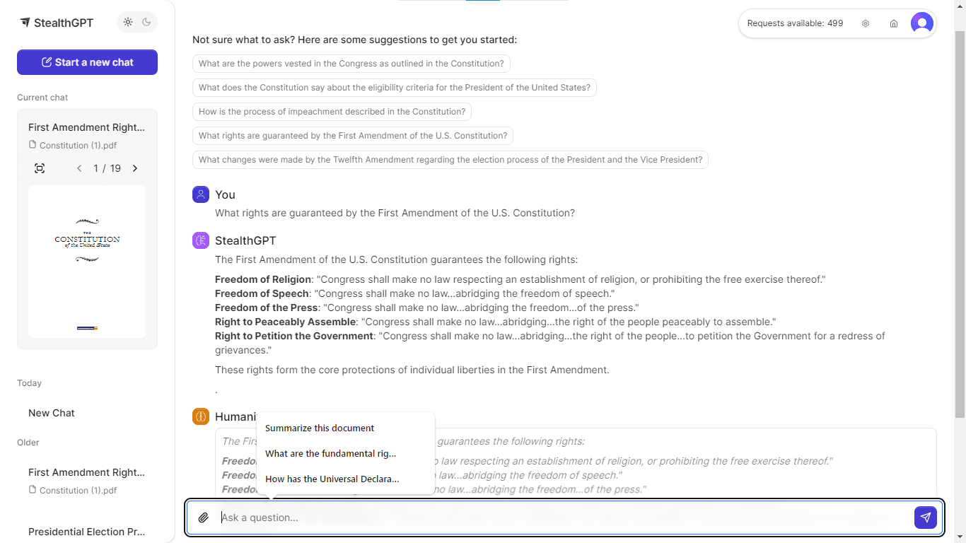 Chat with Stealth is an AI chatbot that responds to questions and carries out tasks such as summarizing text. You can also chat with PDFs using this feature. When you send a PDF to Chat with Stealth and it “reads” the file, you can ask it questions based on that PDF and it'll respond. You can also tell Chat with Stealth to humanize the response.