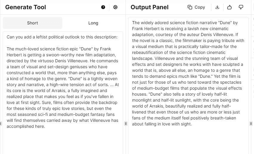 Finally, we take our text that has been altered to target old people that love romantic comedies and ask StealthGPT to give it a leftist political perspective. As you can see, the engine understands subtlety as it interprets leftism by now noting the budget and deconstructing the media of cinema itself in the description.
