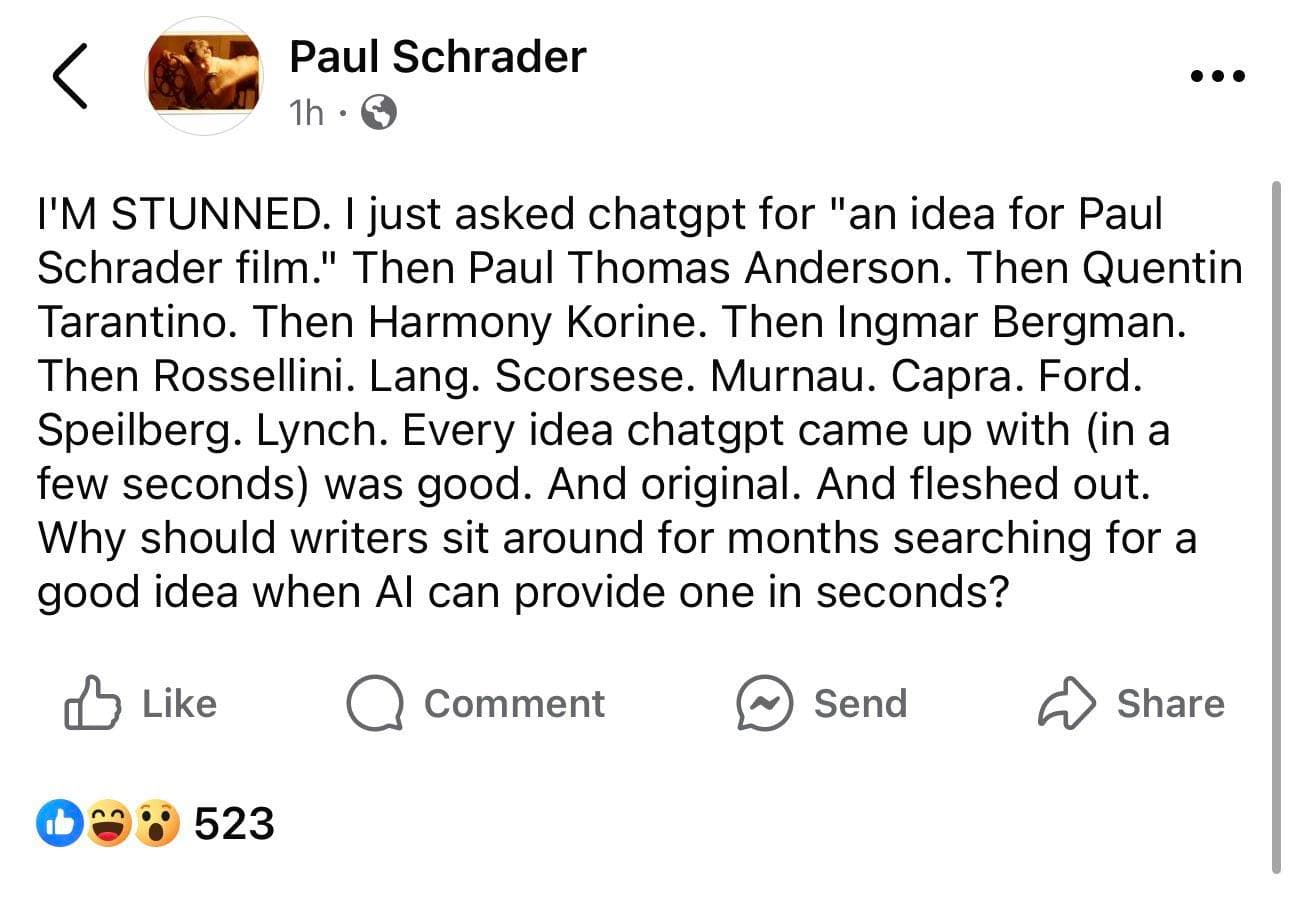 Paul Schrader, screenwriter of Taxi Driver, lamented AI's impressive abilities, accepting that they surpassed his own talent at reviewing scripts, generating ideas, and writing stories from a blank page one.