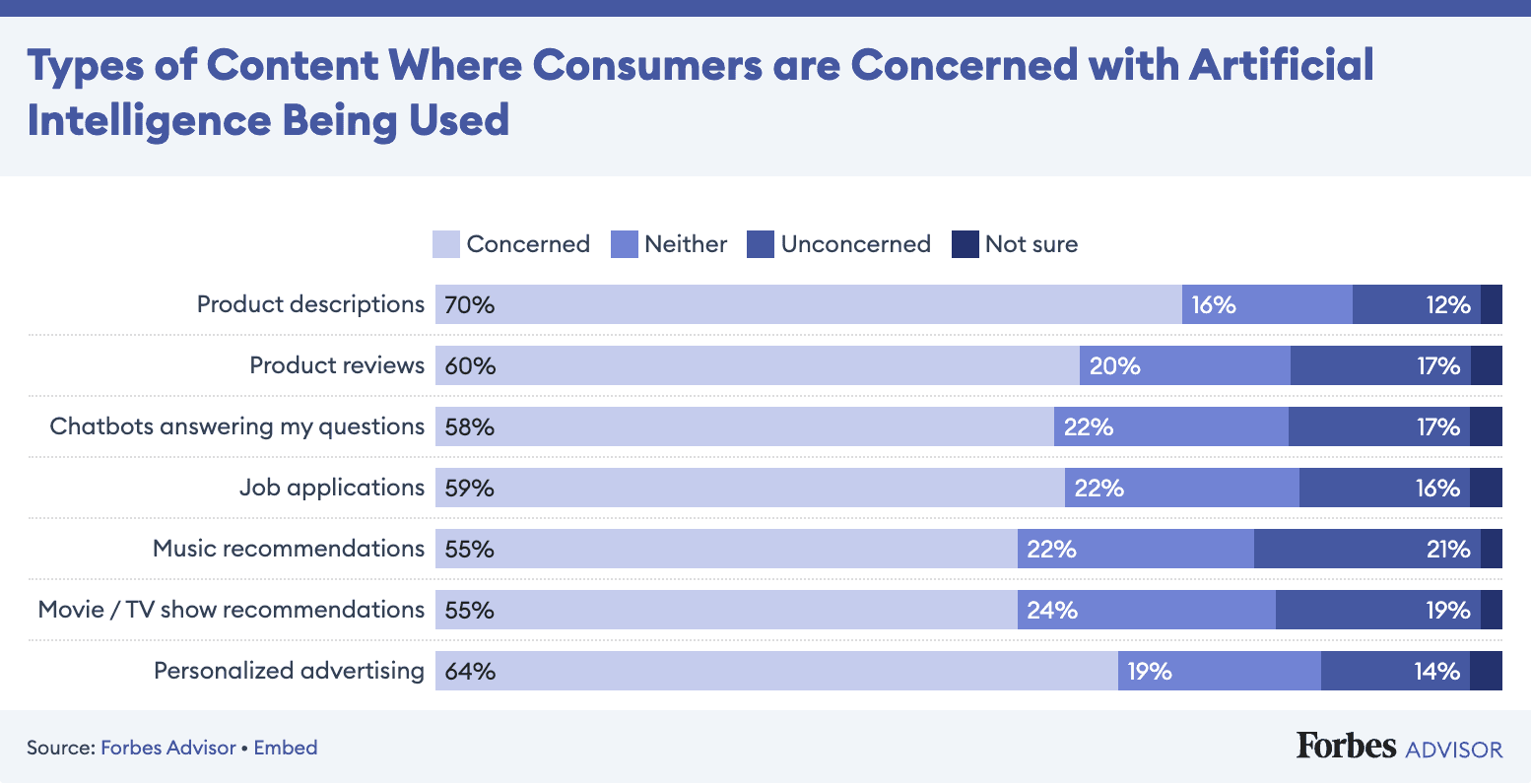 The Forbes graph above recorded consumer sentiments around AI writing and even in the cases of something as irrelevant as product descriptions, a large portion of those that answered felt concerted.
