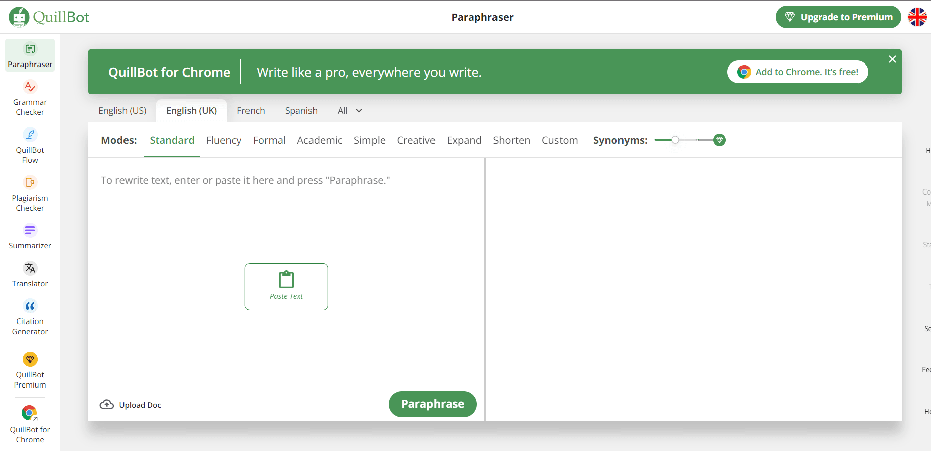 Allows users to rewrite sentences, paragraphs, or entire pieces of text in various modes to either keep the same meaning, increase creativity or formalize the language.