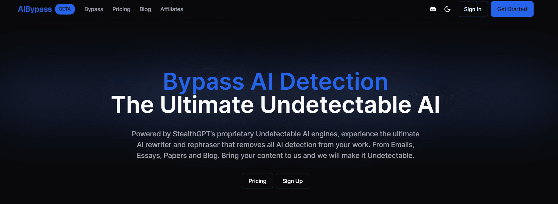 Distinguishing itself with the exclusive undetectable AI engines of StealthGPT, AIBypass goes beyond the capabilities of ordinary text rewriting tools. Its sophisticated algorithms are specifically designed to erase any signs of AI creation, offering a unique solution for content creators seeking an edge.