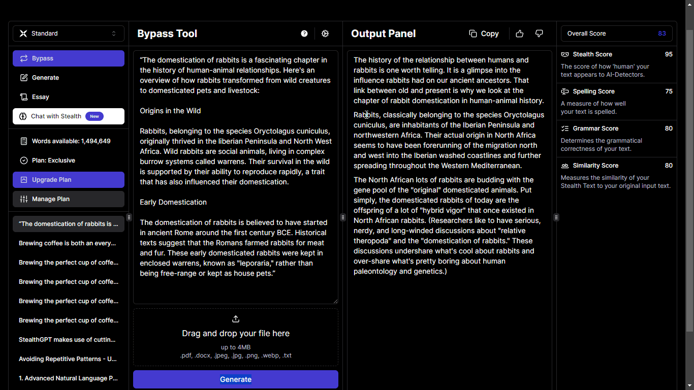 Furthermore, thanks to StealthGPT's rapid response time, you can use it to generate content in bulk. And if you earn a living from writing, joining StealthGPT is the tiny investment that you need to make in order to supercharge your content writing, attract more clients, and ultimately make more money. Since StealthGPT's outputs are usually easy to understand and unambiguous, you'll also spend less time proofreading and editing them.