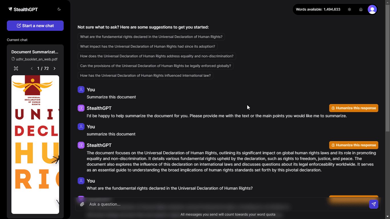 Besides content generation, StealthGPT's time efficiency helps with reading. Do you ever feel like you're not up for reading a lengthy academic paper and would rather just have the key points under your belt? Using Chat with Stealth, send StealthGPT the document and ask it to summarize the paper for you. It'll do that almost instantly.