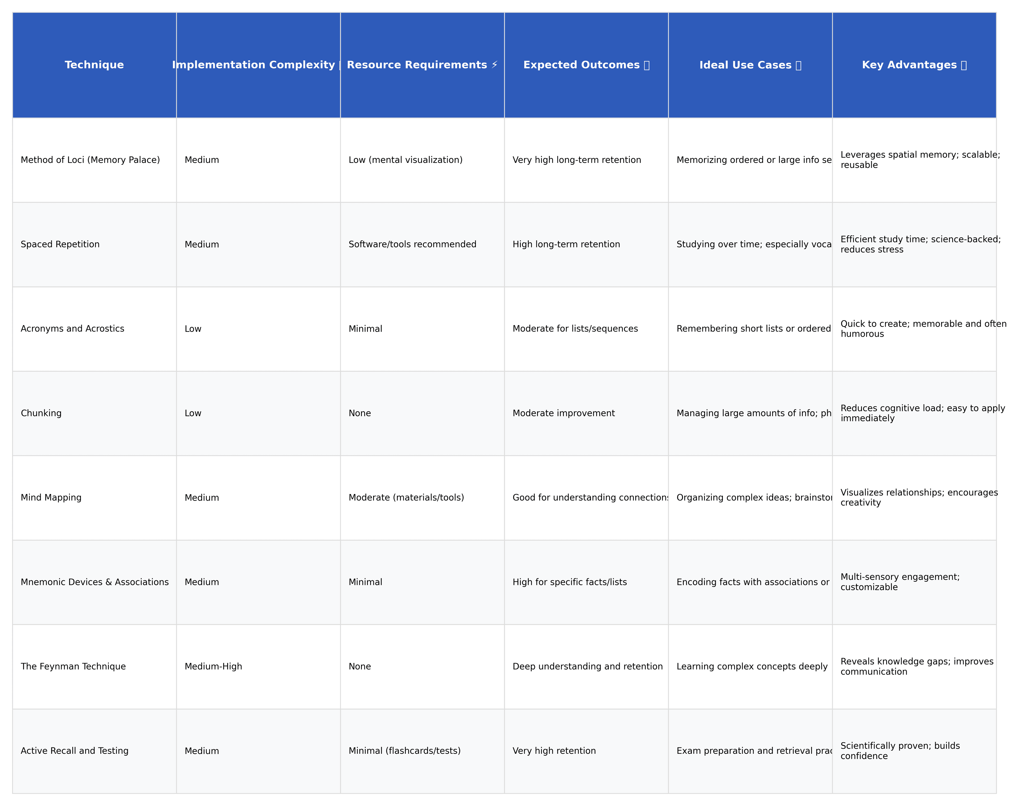 Memory Techniques Comparison Matrix