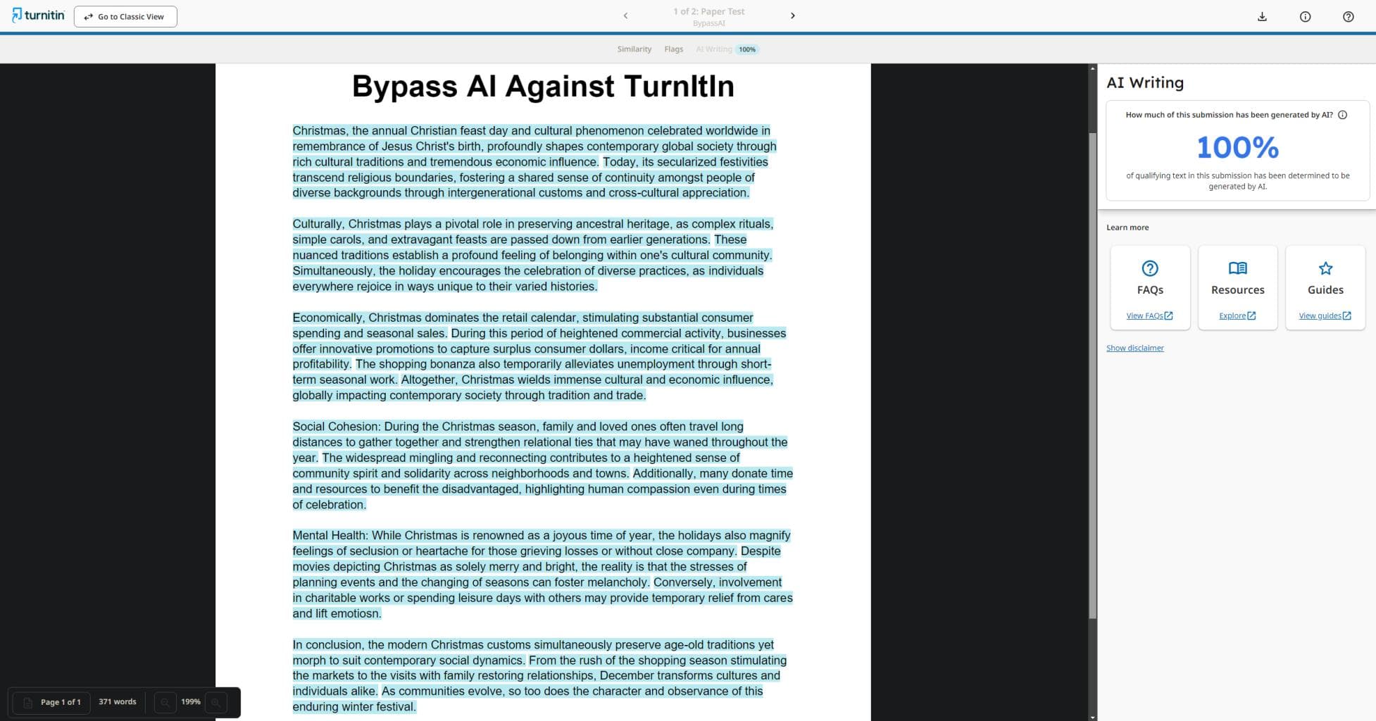 At this point are we even surprised? 100% AI detection score from Originality is a clear sign that Bypass AI cannot bypass major AI detectors. Let's see how Bypass AI goes up against TurnItIn.