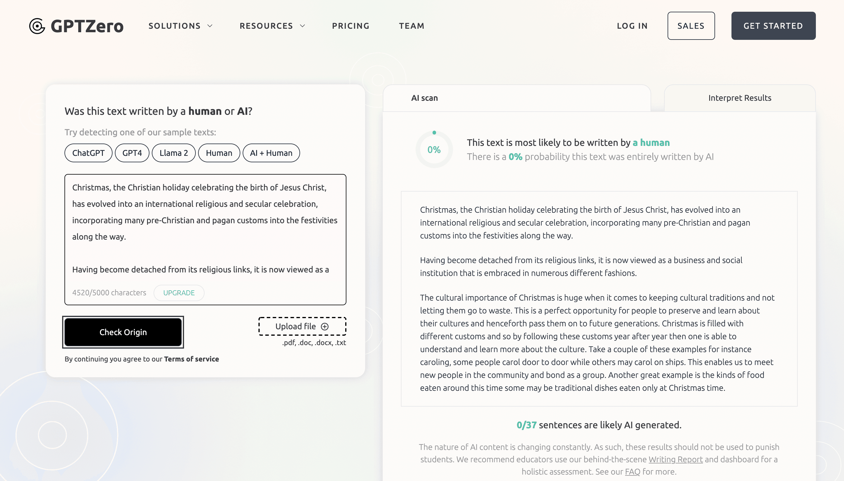An impressive 0% AI written score. Let's not get too excited and see how StealthGPT goes up against Originality and TurnItIn. It might be a fluke that StealthGPT is able to bypass GPTZero.