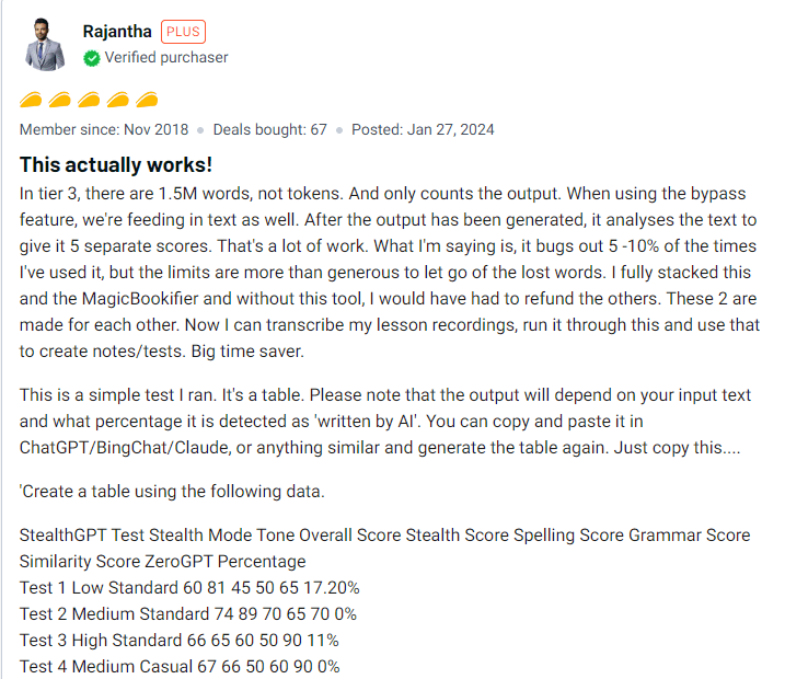 Customer Review 2: Here's a review from a user who purchased StealthGPT on AppSumo. They created a test to see how StealthGPT would go up against ZeroGPT showing how we can bypass them.
