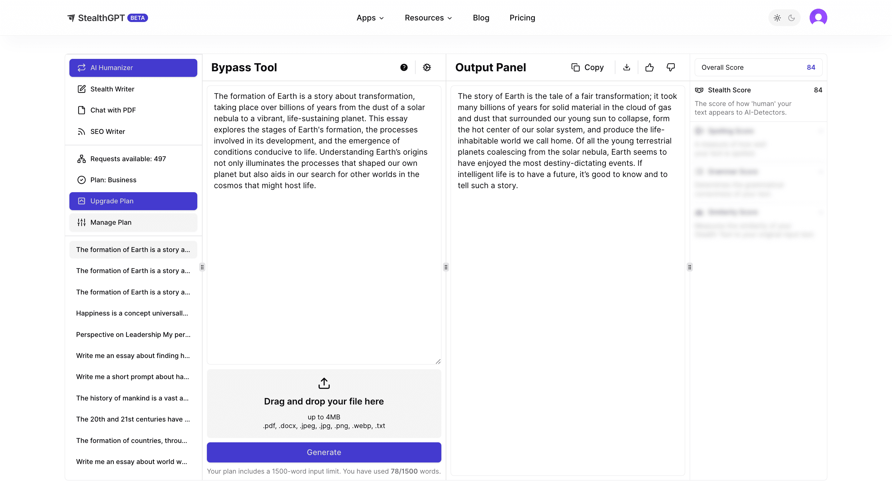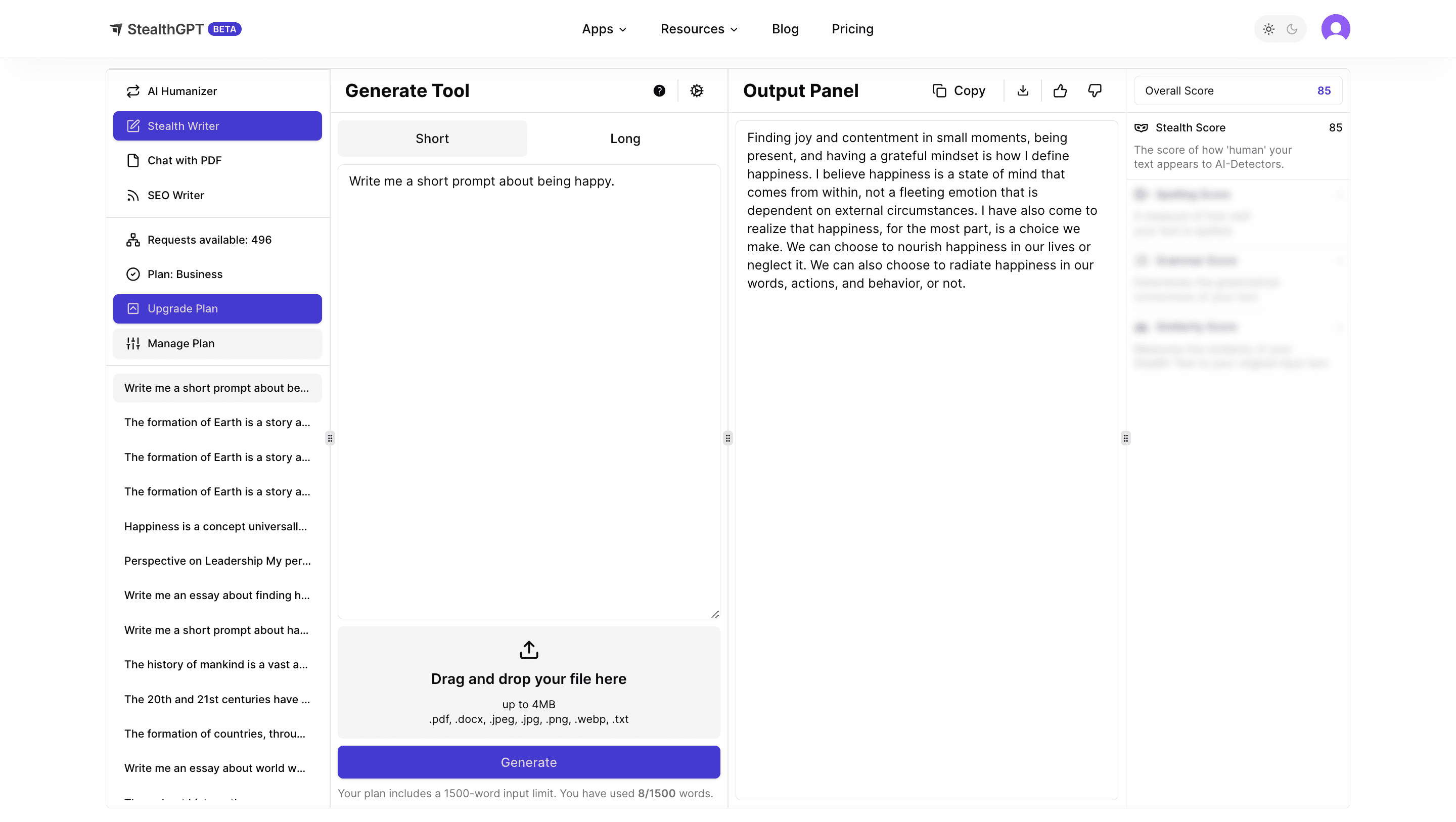 The Stealth Writer Short Prompt will allow you to generate prompts from scratch and it is undetectable as well. All you need is just to send any prompt and it will process and give you high-quality content that is not only fresh, unique, and creative but also coherent, readable, and grammatically correct.