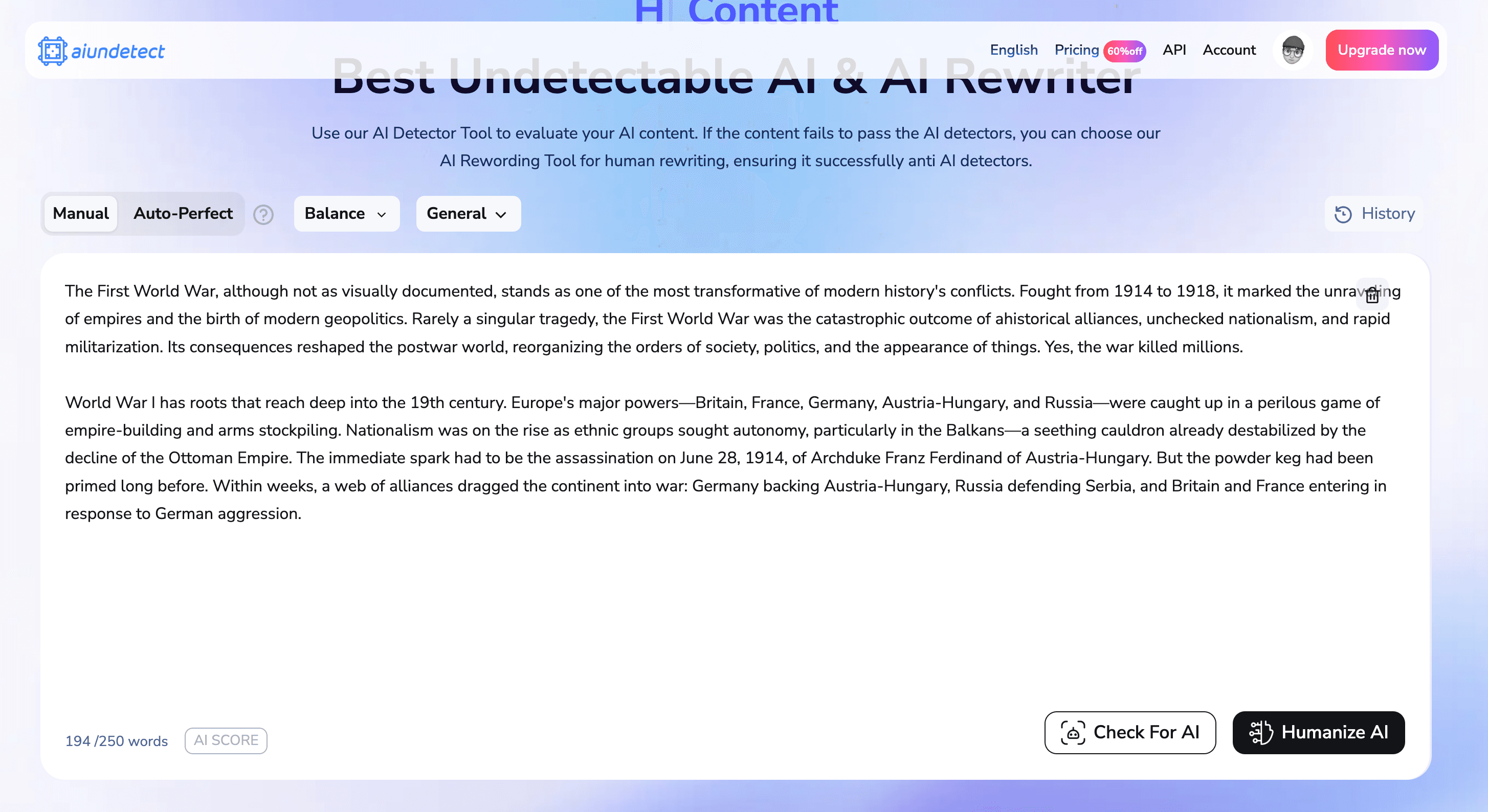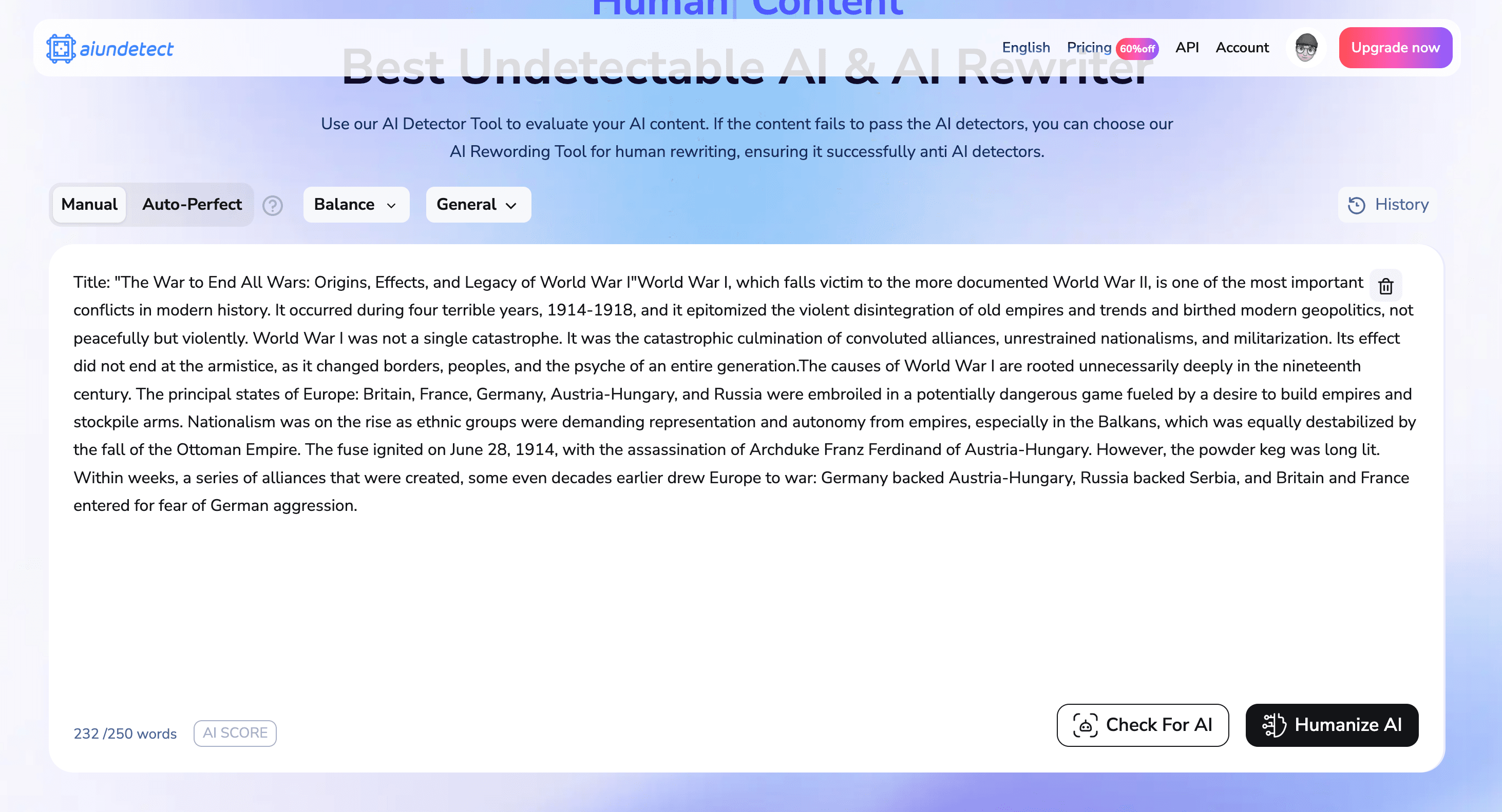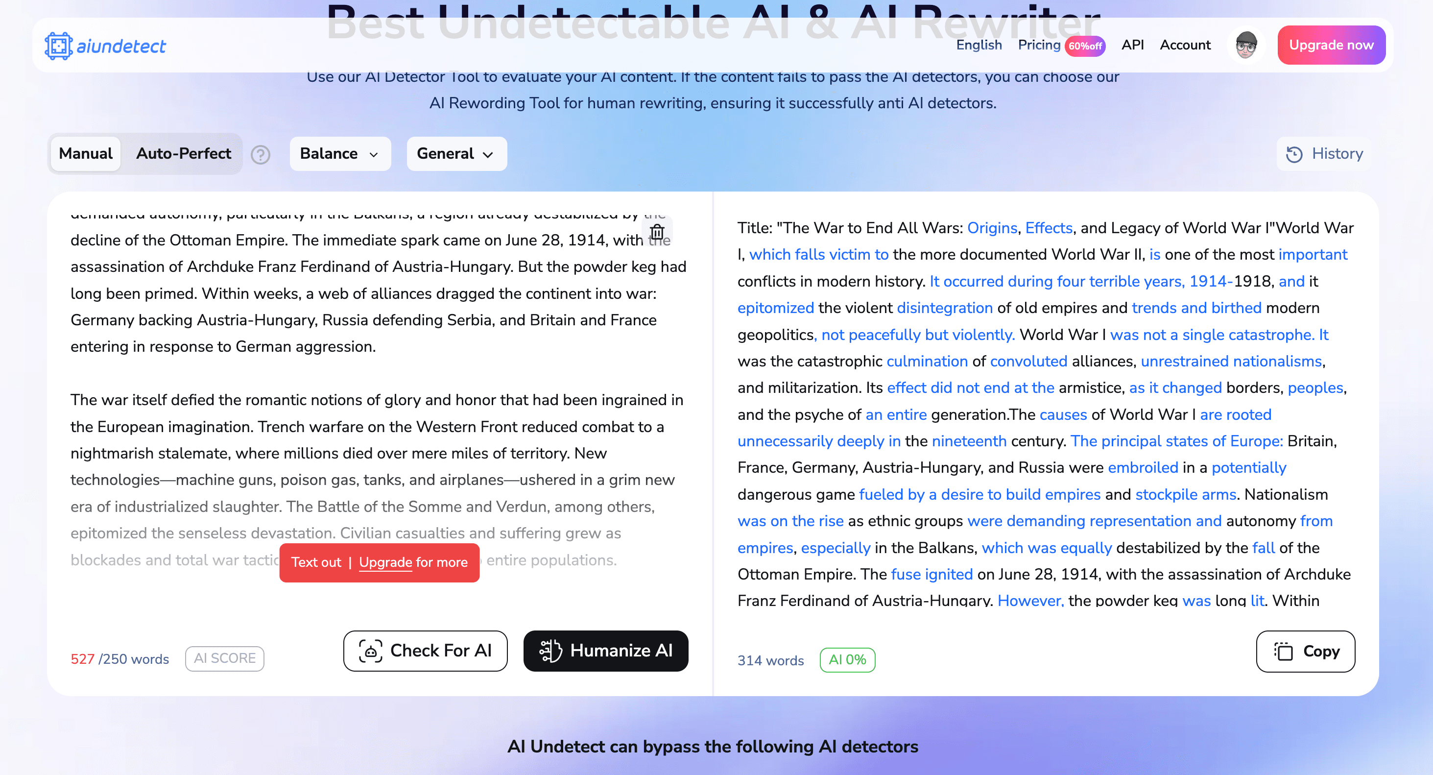 With a clean interface and simple controls letting you either use their detector or humanizer, this seems like an easy, free AI writer that might actually work for someone that just types in the right search query and finds it on Google.
