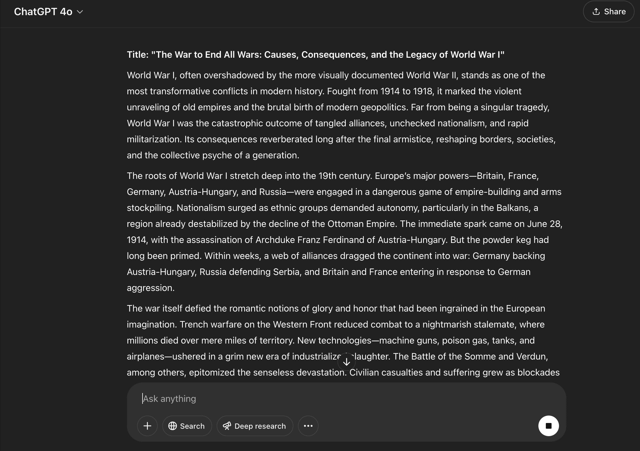 First, I'm going to ask ChatGPT 4o to write me a college essay about World War I. Check it out for yourself, ChatGPT has evolved quite a bit to make their essays as readable as they've become in their more recent AI models.