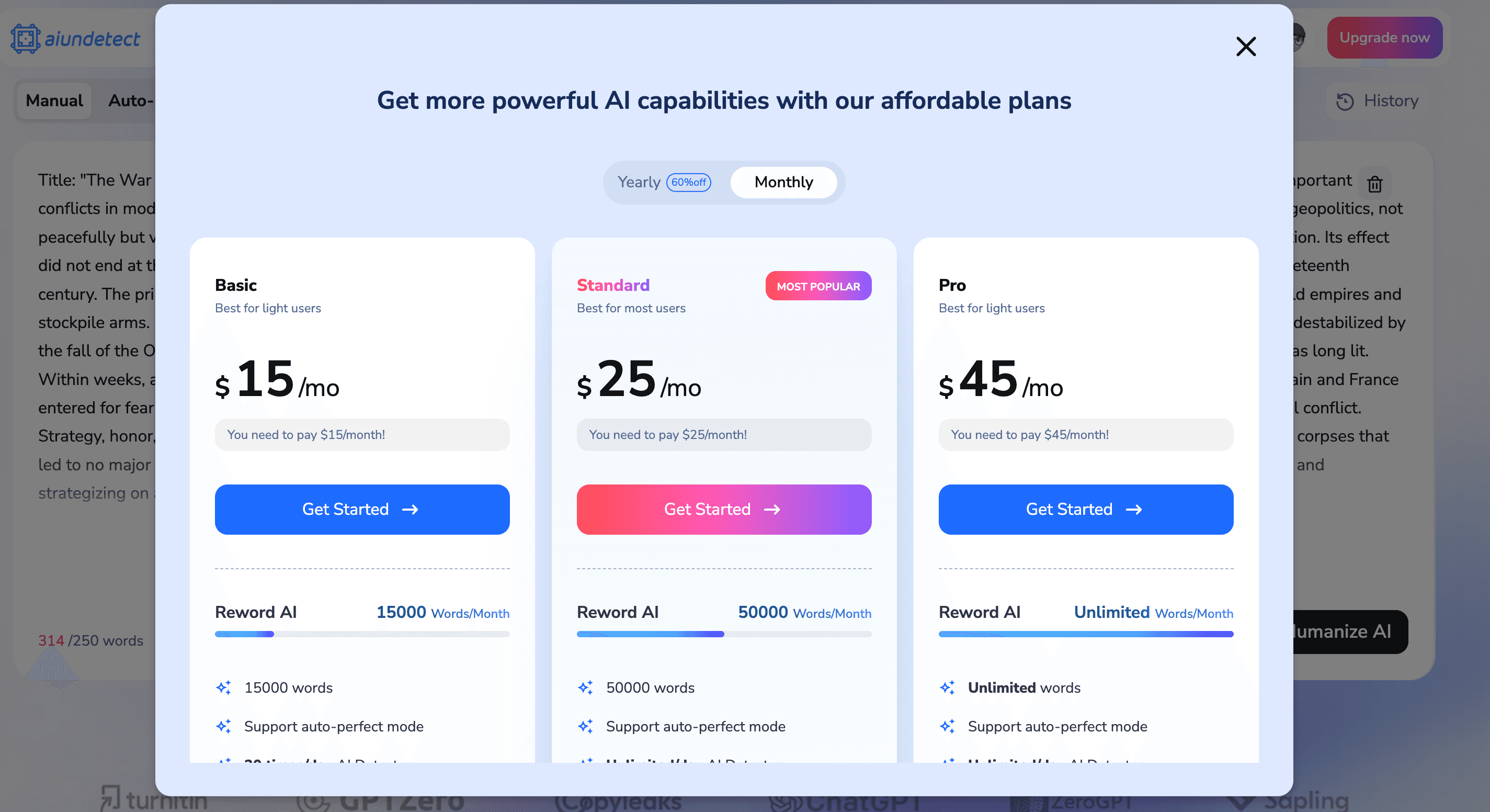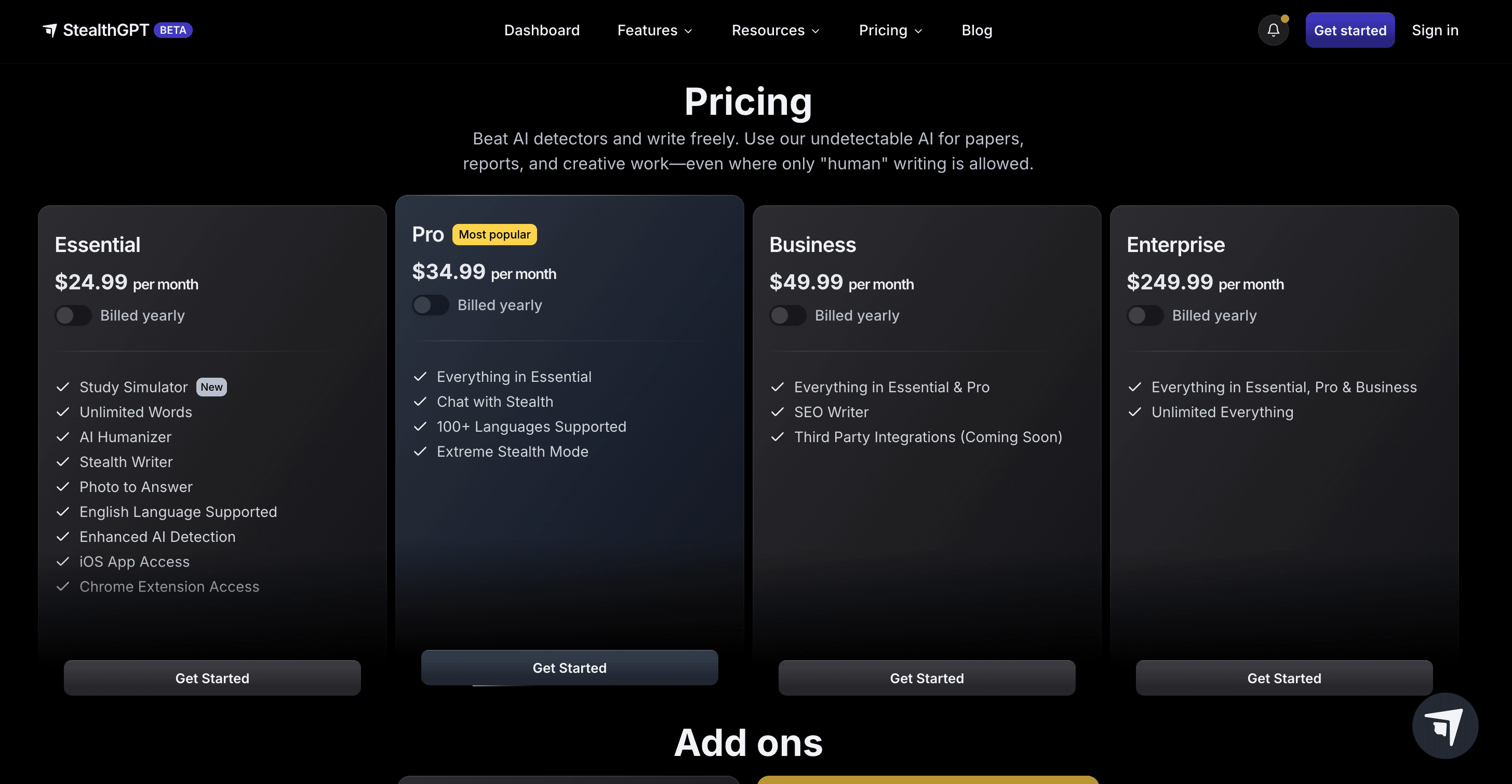 Now that we've thoroughly discredited their free version, lets look into the various packages offered by AI Undetect and compare them to StealthGPT. Here's the pricing breakdown for AI Undetect: