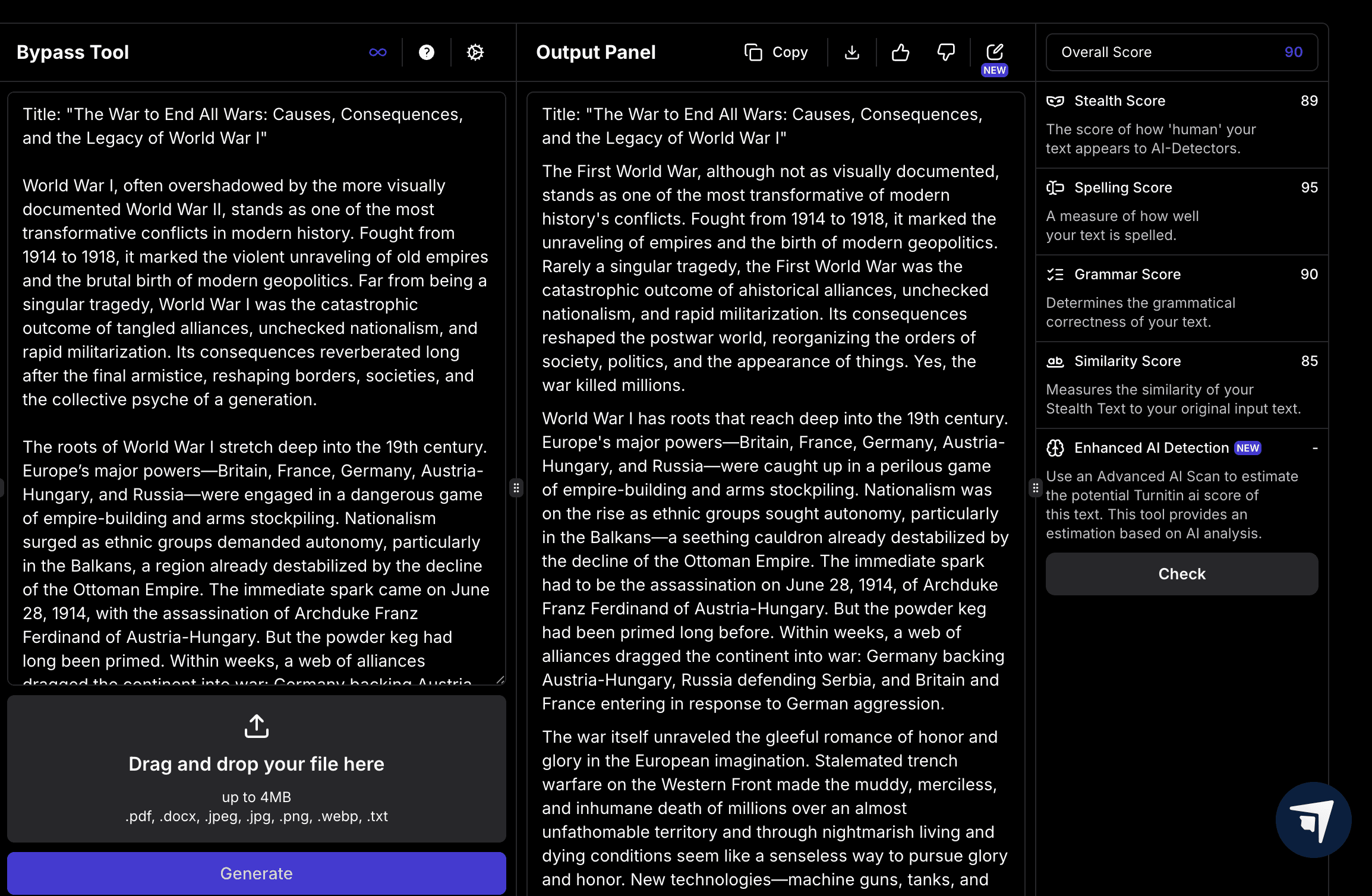 Now I'm going to put this software through a real test, StealthGPT's AI detector. Using both enhanced AI detection and standard, we will be able to decipher whether this text will pass our smell test and Turnitin's.