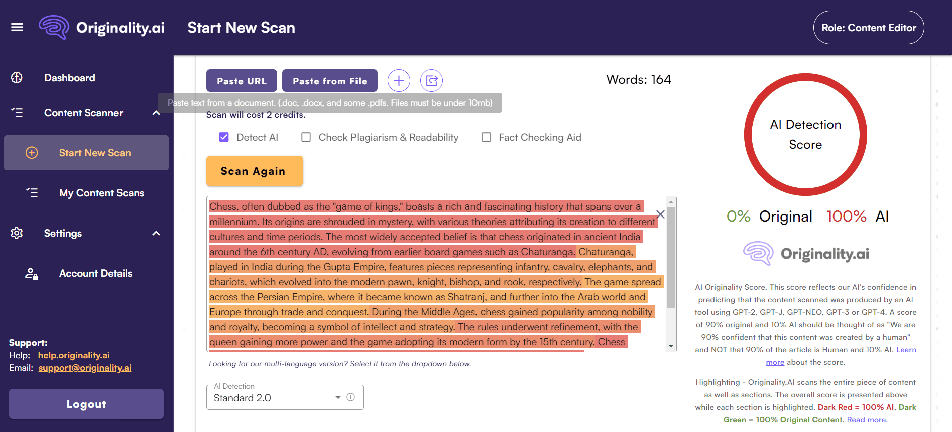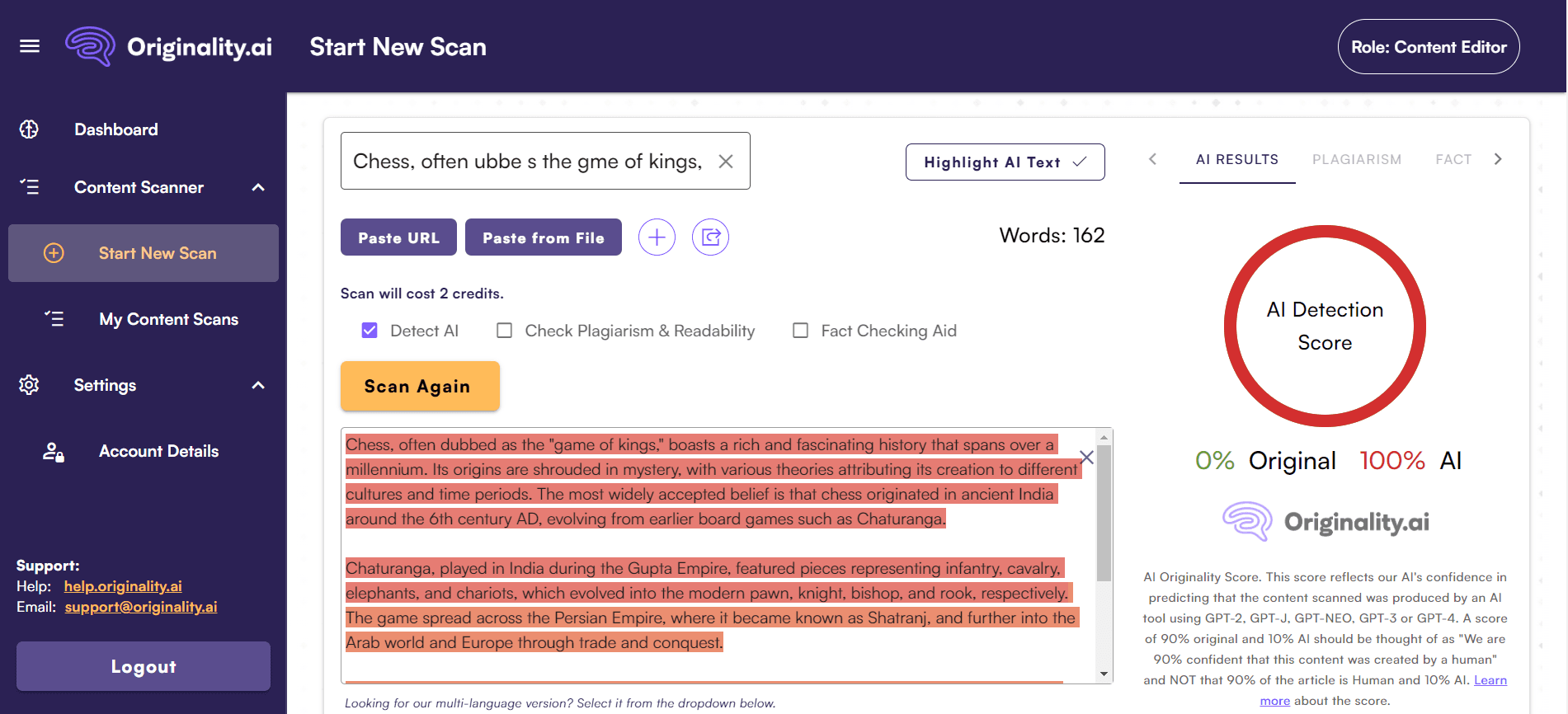 With our first test, I will now run the original version through Originality.AI, a highly respected AI checker known for its advanced detection technology, as well as the toughest AI checker to beat in the market. Then I will continue to scan CheatGPT's text with Originality.AI to see how it is perceived. Let's look at the results!