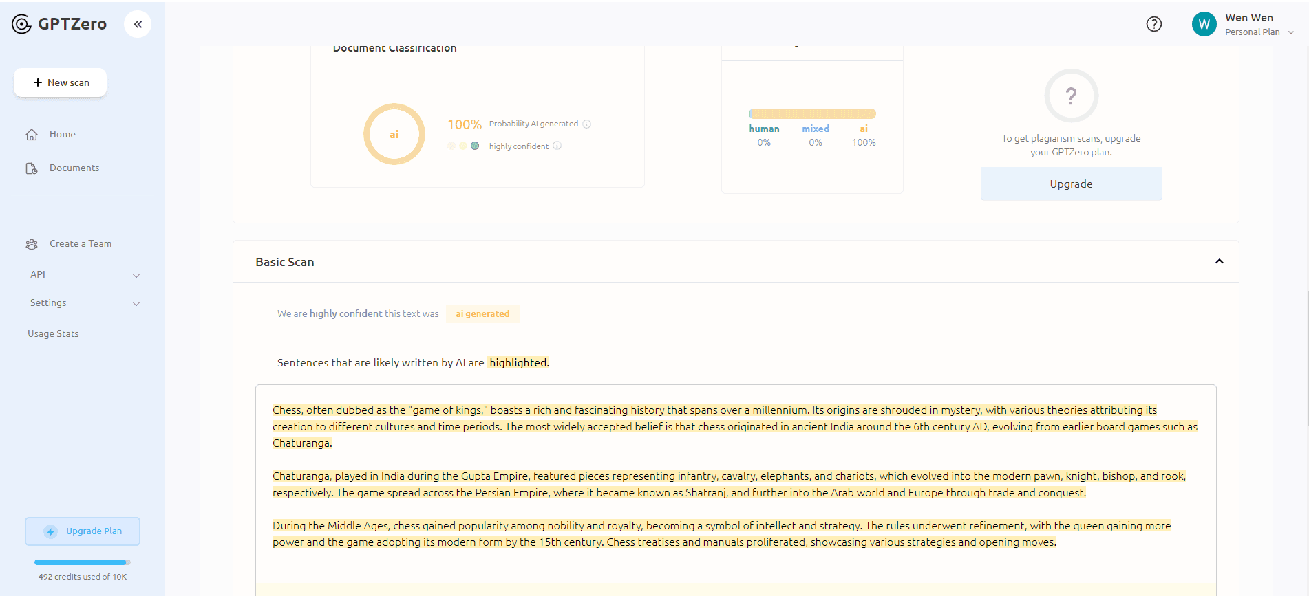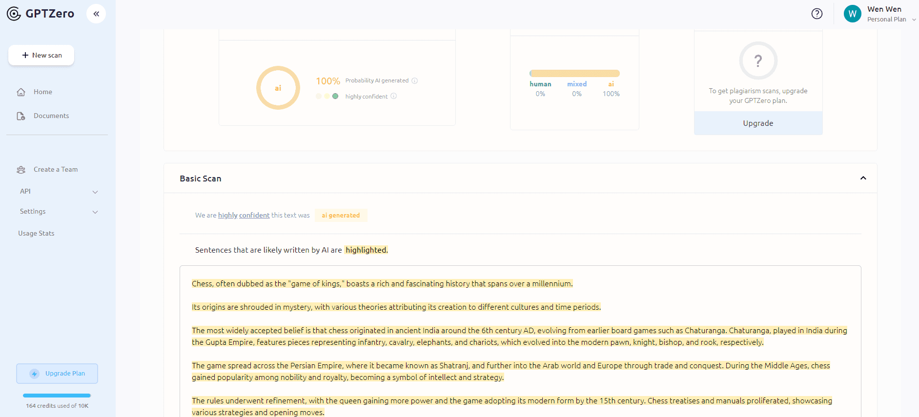 For the second test, I continued to put CheatGPT content in the Copyleaks AI detector as well as the original version that ChatGPT produced for the same experiment.