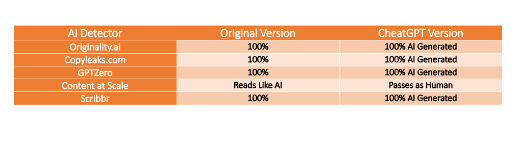 At first glance at the table above, we can easily see that the results already speak for themselves. For only 5 AI checkers in this experiment, 4 out 5 claimed that the content generated by CheatGPT was flagged as 100% AI-generated. It came to the conclusion that CheatGPT can not beat any advanced AI detectors out here with its capabilities and features because it actually doesn't do any humanizing, and it absolutely failed on what it claimed on the website that it was the ultimate AI detection bypass tool.