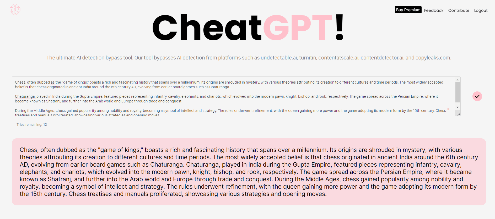 There are many so-called undetectable AI writing tools out there nowadays, and CheatGPT is one of them. With its claims to be the ultimate AI detection that can bypass AI detection from platforms such as Undetectable.ai, Contentatscale.ai, Copyleaks.com, Orginality.ai, and GPTzero.