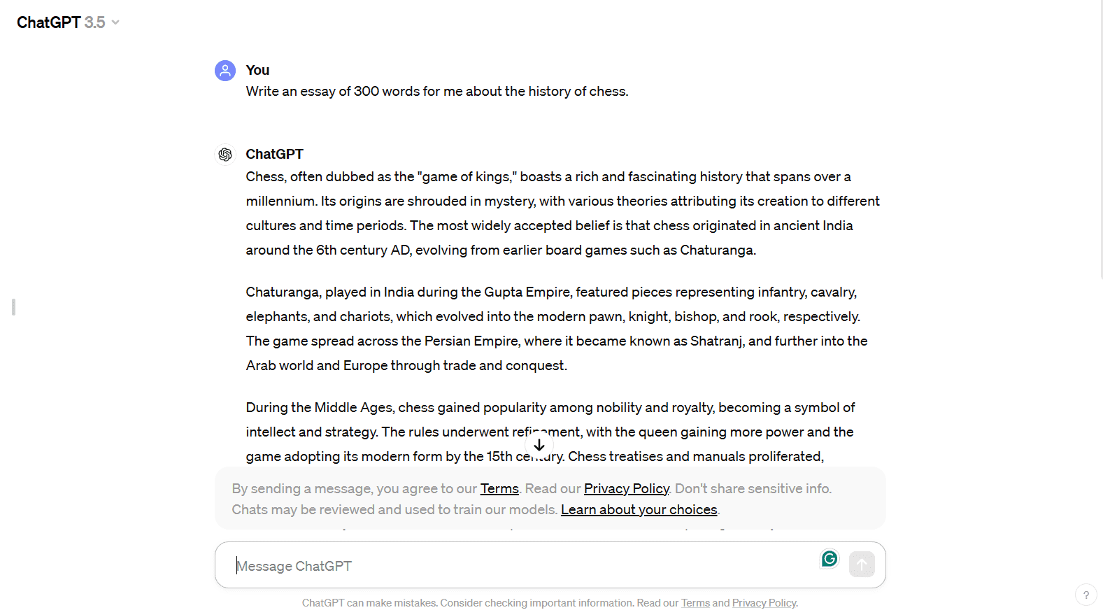 To start off, I visited the ChatGPT website and asked for a prompt to produce a 300-word essay about the history of chess for me. Here’s what ChatGPT provided: