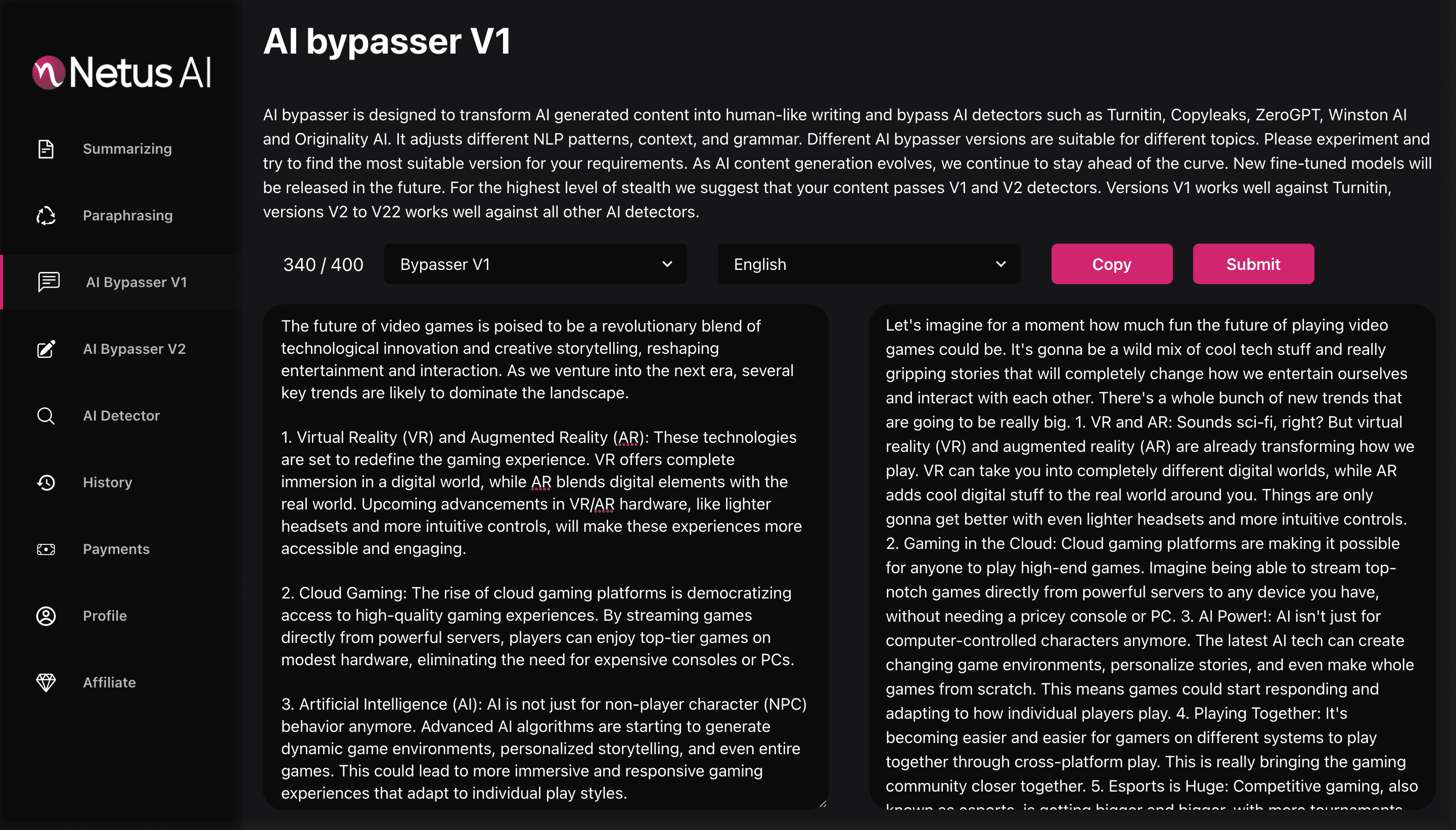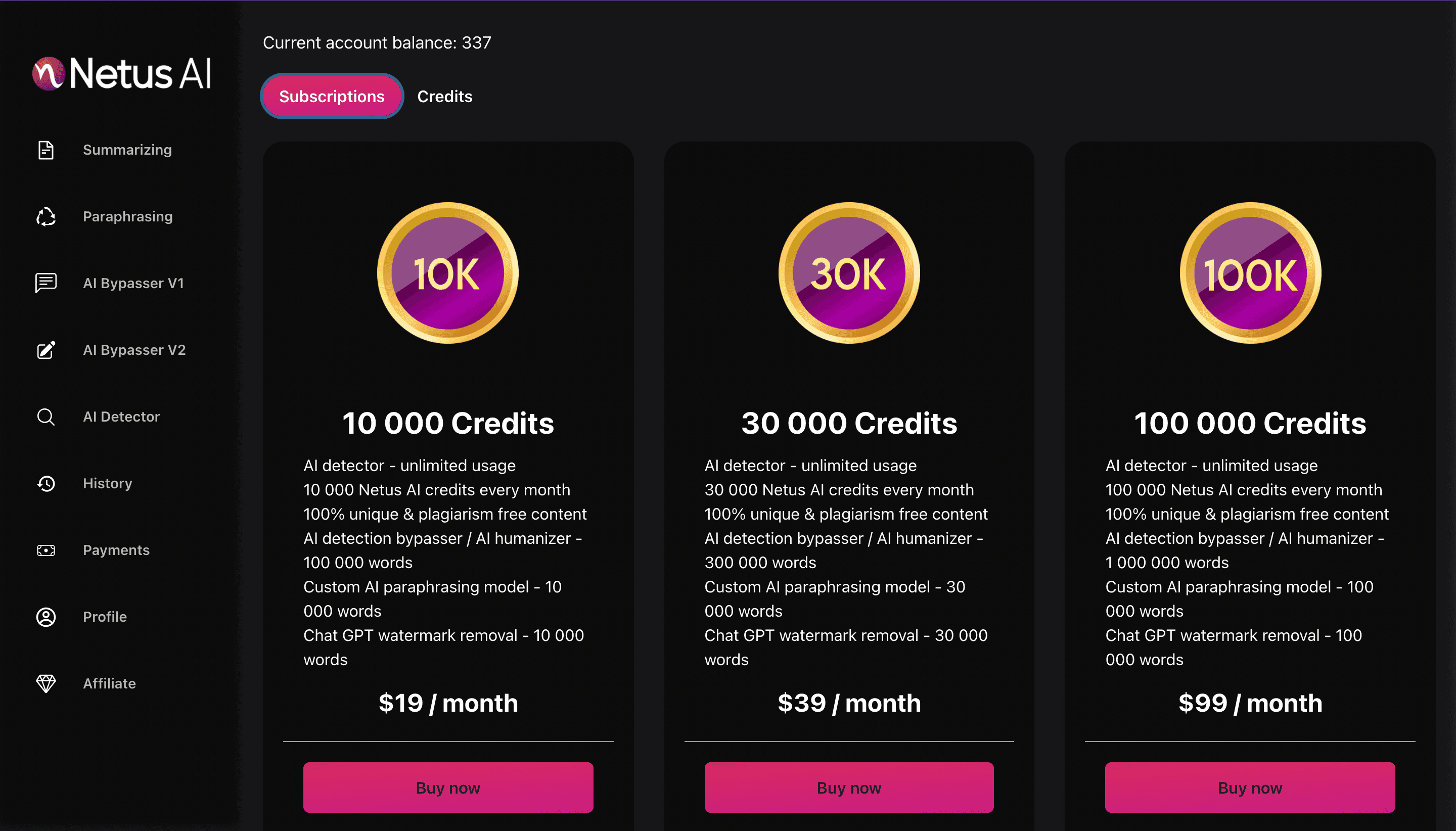 Netus AI offers a subscription based pricing as well as a credits option for users. Netus AI is also more expensive than StealthGPT's pricing for the same value of 100,000 undetectable words. If you are someone who want to use the bypasser feature, you are better off using StealthGPT. Netus AI fails to bypass major AI detectors plus StealthGPT bypasses even Netus AI's AI detector. In the end, it's up to the users to determine which website they see is better according to their needs but StealthGPT's value is unmatched against Netus AI.