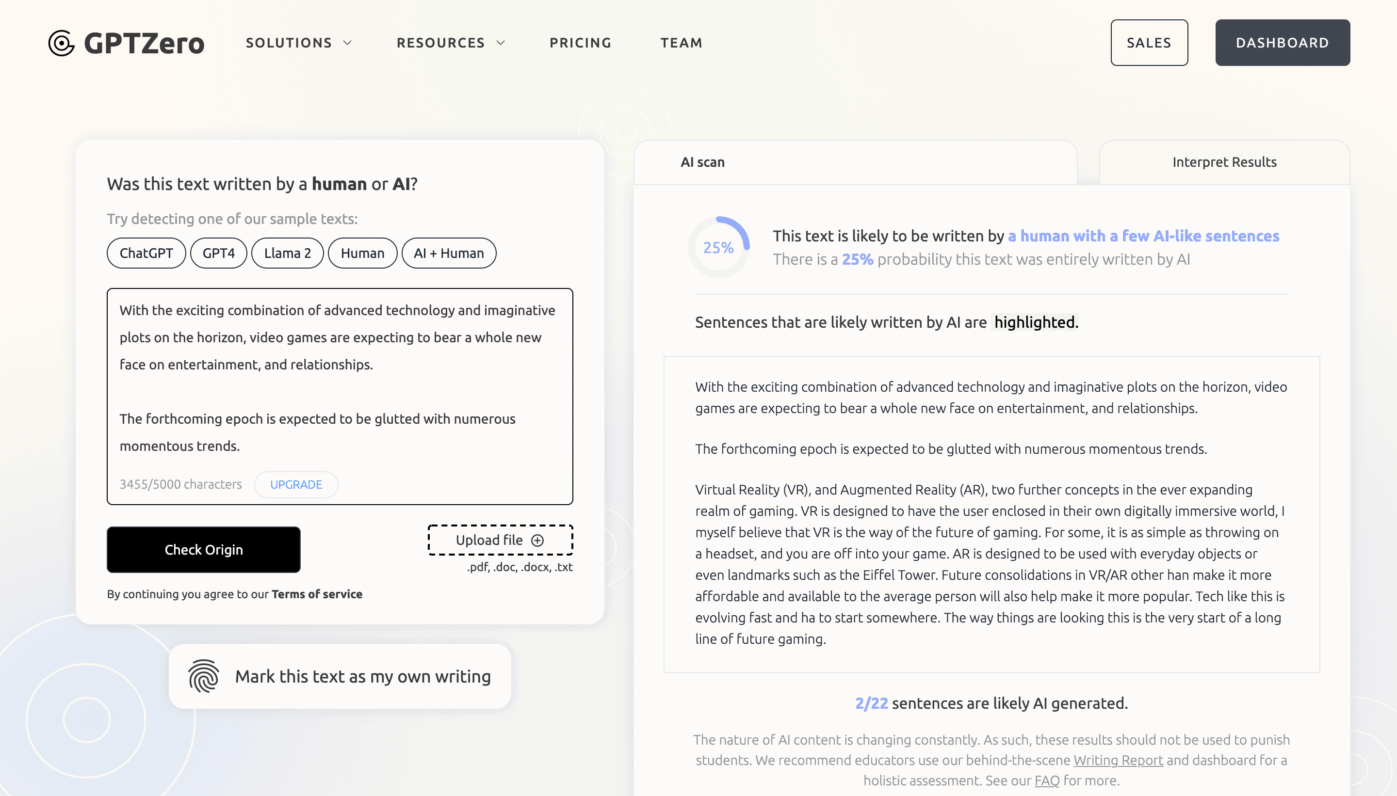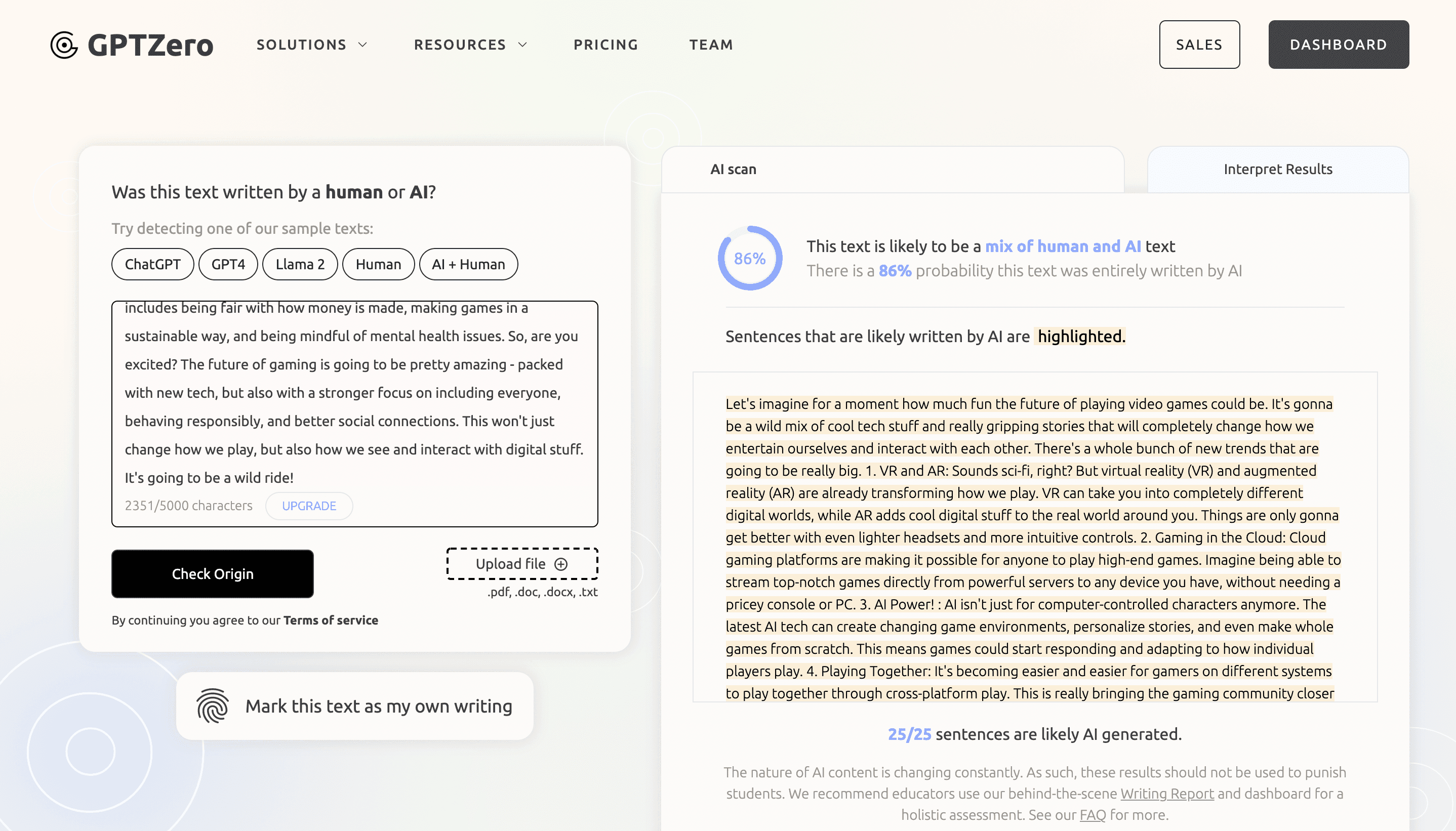 An improvement against Netus AI, StealthGPT is able to get a lower score of just 25% AI written score with a mixture of human sentences. It's important to note that only 2 out of 22 sentences were detected as AI generated. It is easier to just remove those sentences to receive a better score.