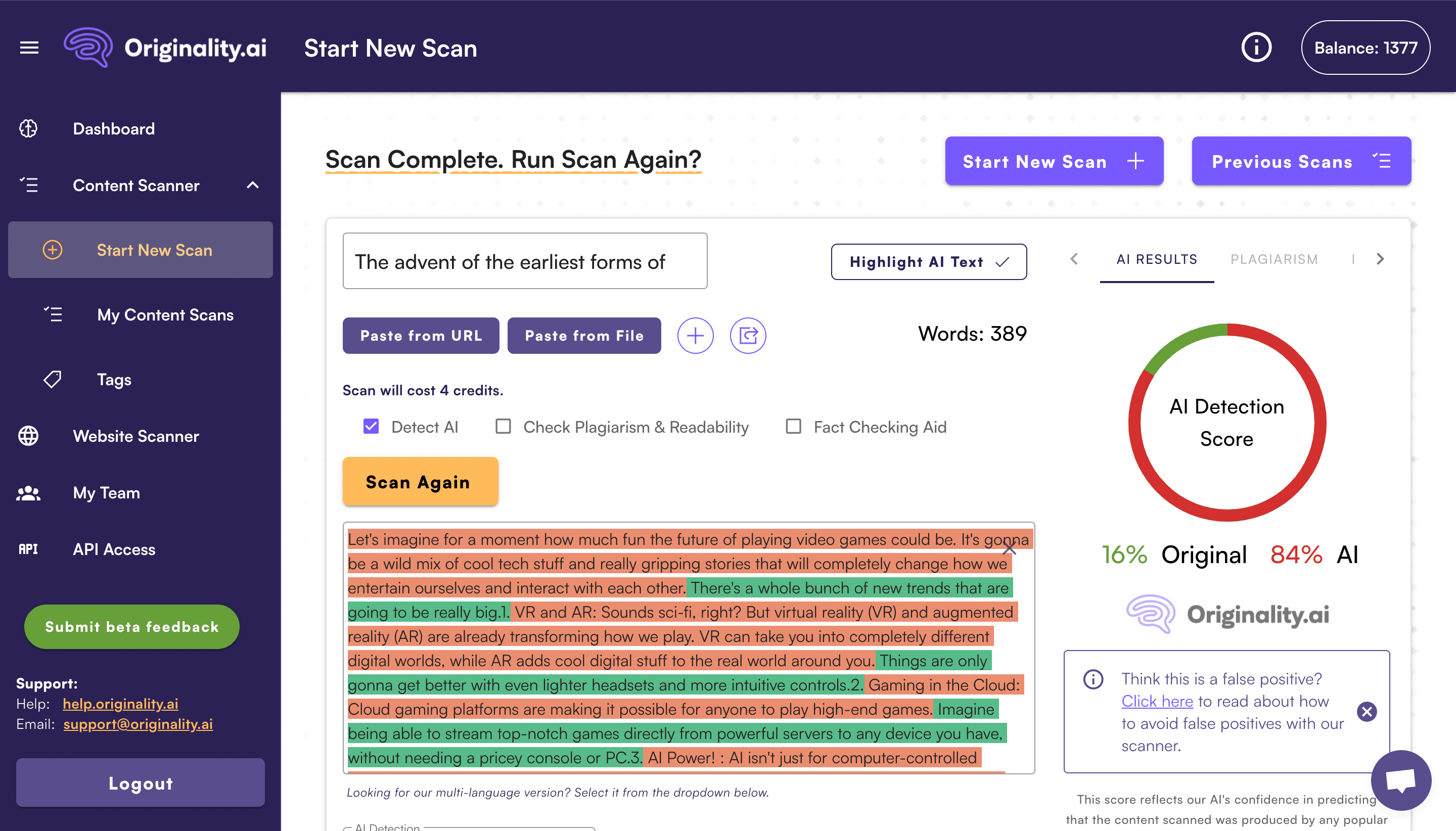While slightly lower than GPTZero, Netus AI scores over 84% AI detection score from Originality. Netus AI's undetectable AI text does not seem to be working.