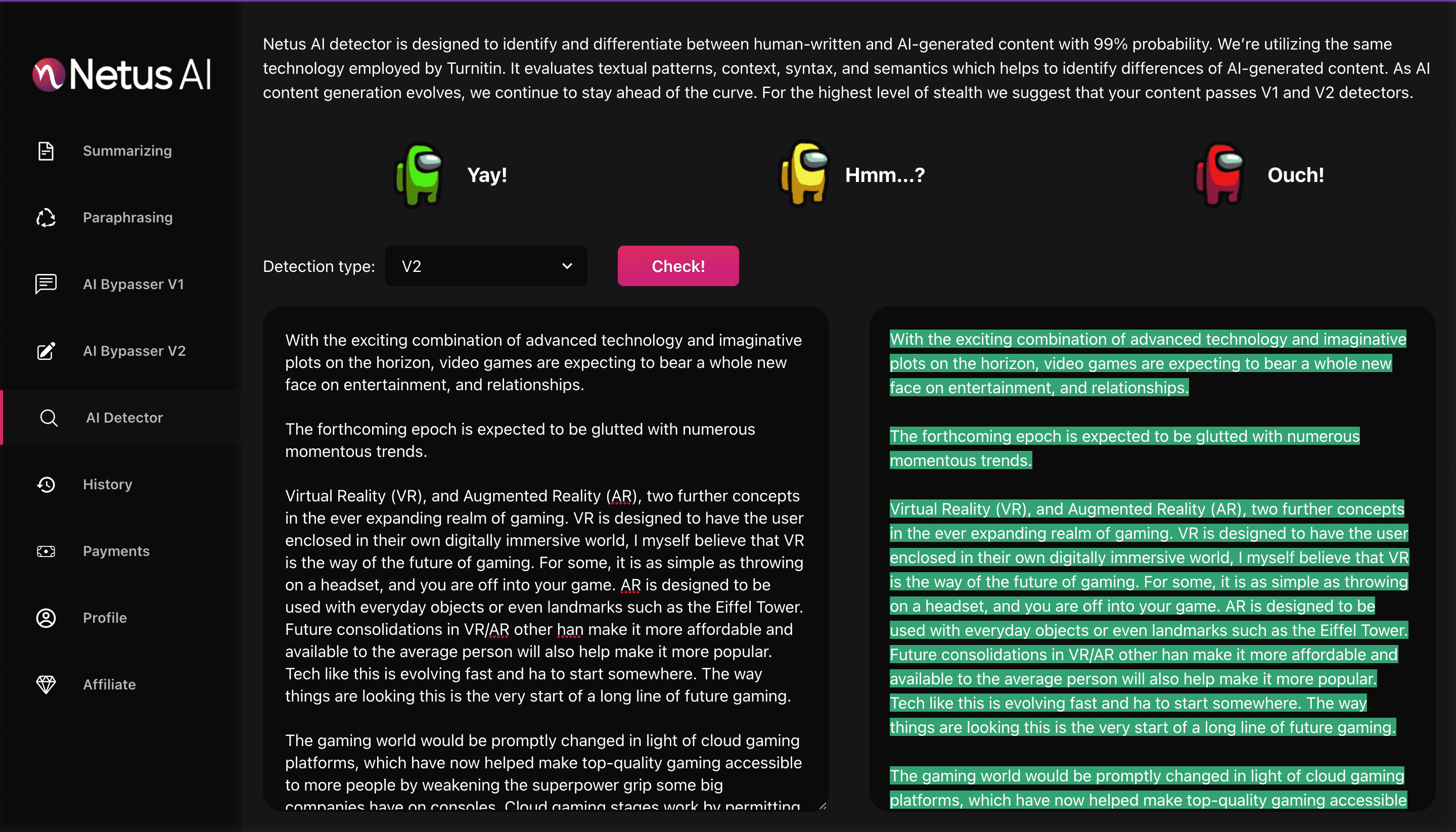 StealthGPT bypasses both V1 and V2 detection type from Netus AI's advanced AI detector that similarly uses technology that of TurnItIn.