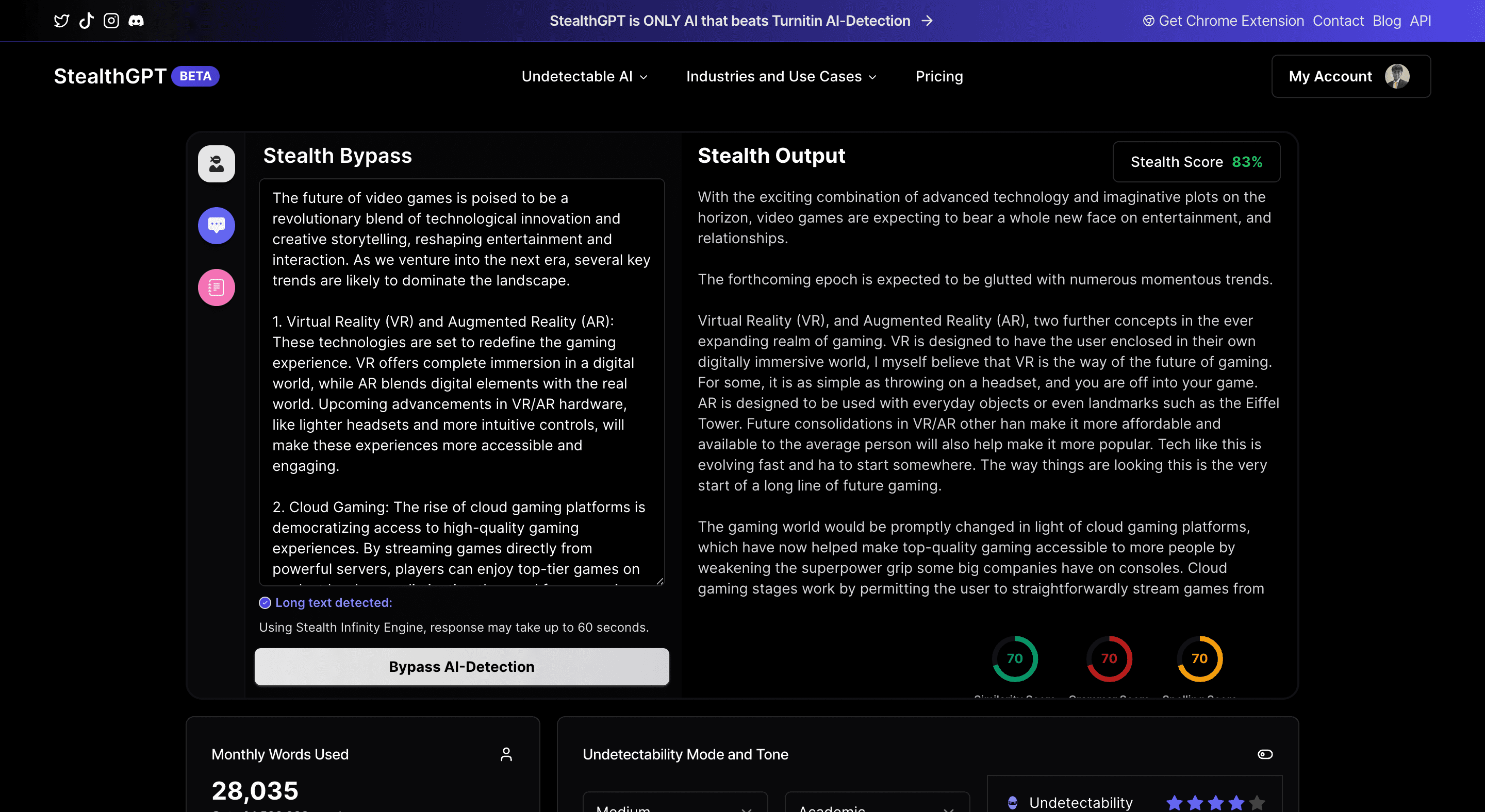 StealthGPT is the best Undetectable AI website out there, beating major AI detectors such as GPTZero, Originality, and TurnItIn. If you are a highschool or college student looking for the best AI humanizer tool in the market then look no further. It's simple, easy to use, and there's plenty of evidence you need to give you the assurance of staying undetected. Try StealthGPT out today!