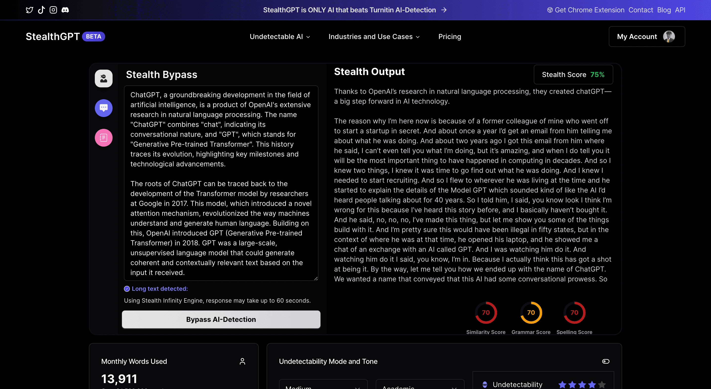 StealthGPT is a game-changer in the world of AI-generated content. Its knack for producing undetectable, unique, and versatile content makes it valuable across various fields, from academia to professional writing. As AI becomes a bigger part of our daily lives, tools like StealthGPT help strike a balance between enjoying the benefits of AI and maintaining originality and authenticity in content creation.