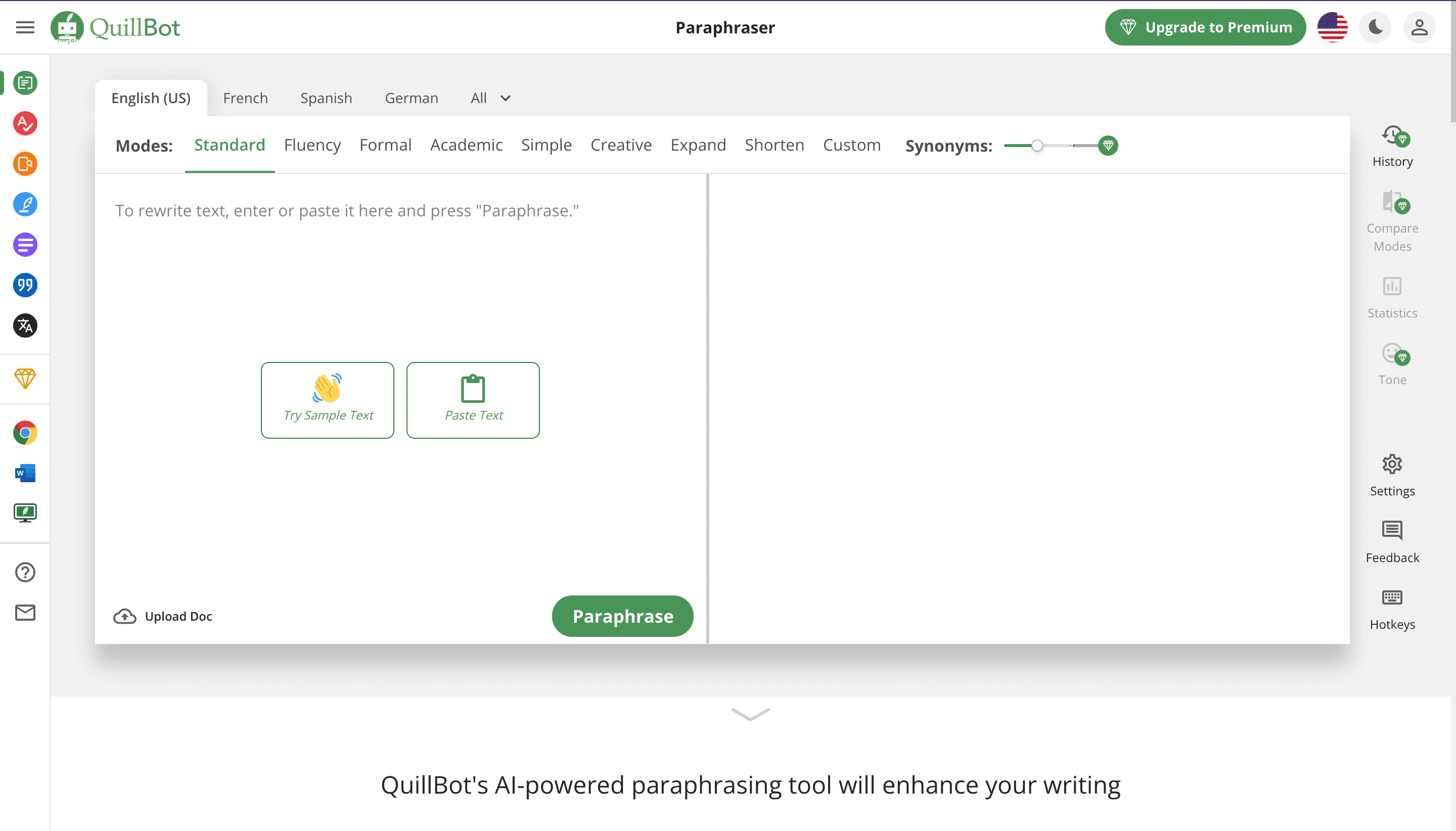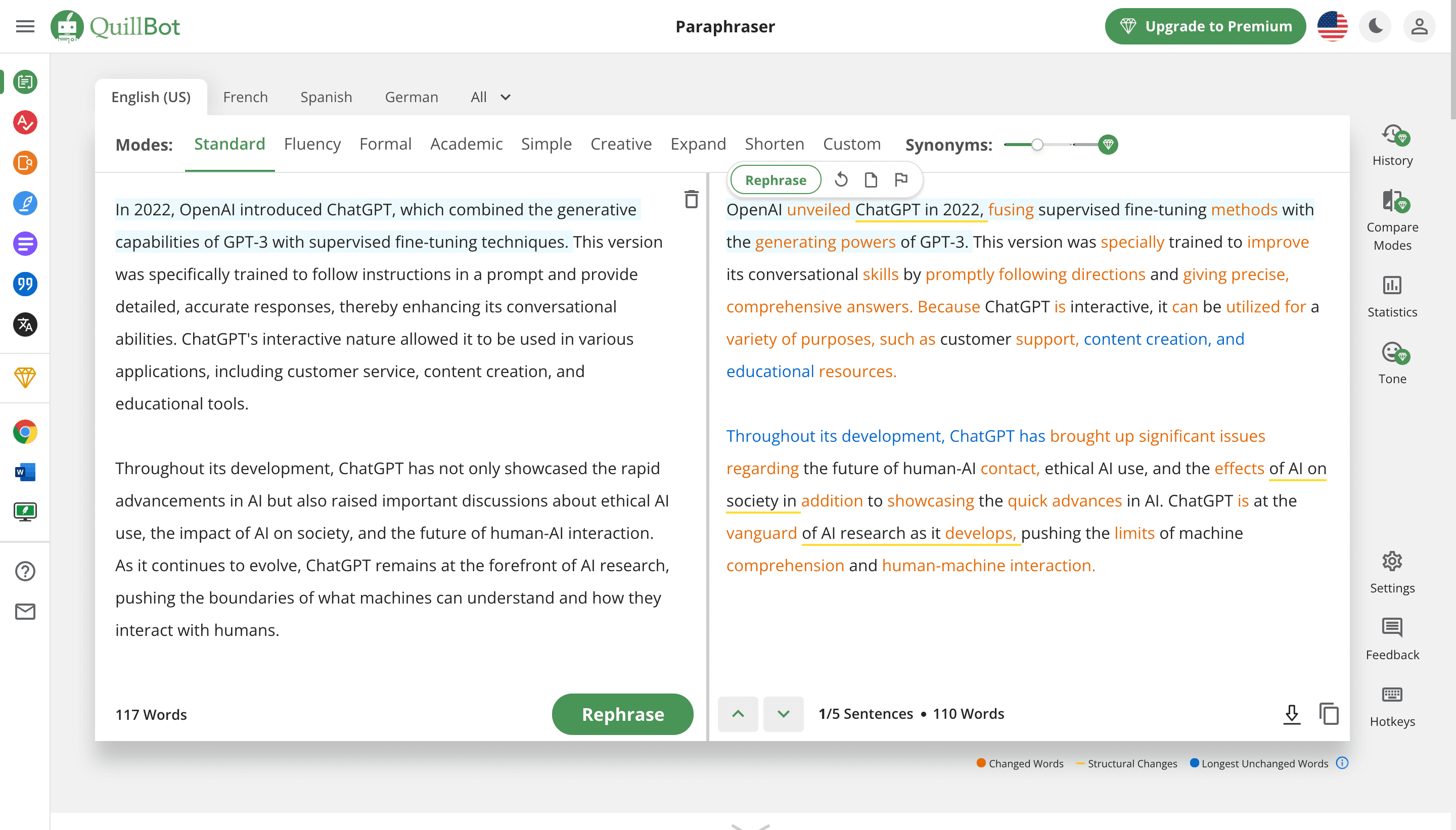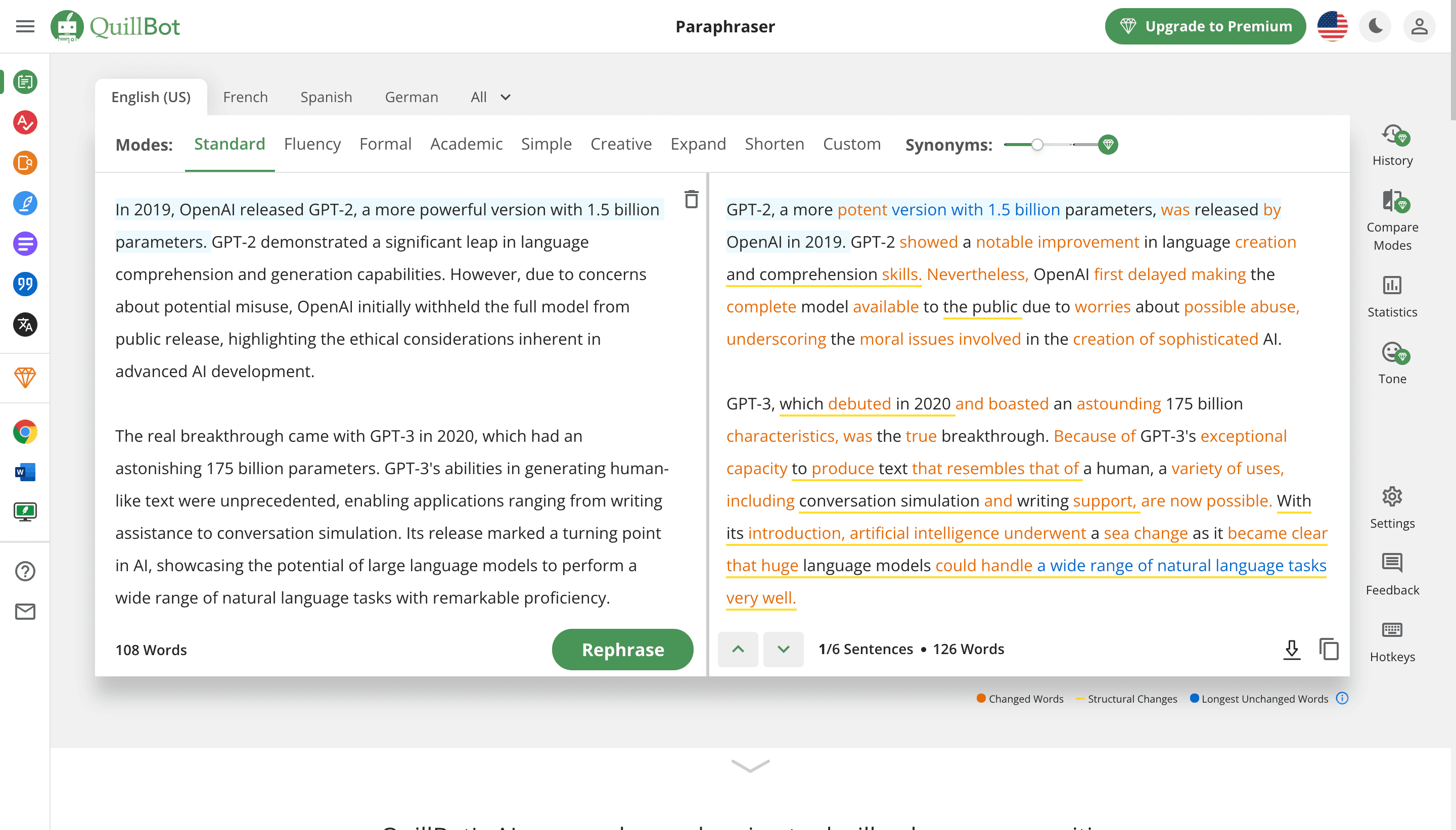 Paraphrasing Tool: Quillbot's primary feature is its paraphrasing capability. It offers multiple modes, such as Standard, Fluency, Creative, Formal, Shorten, and Expand. Each mode caters to different writing needs, whether it's maintaining the formal tone of an academic paper or seeking a more creative expression for a blog post.