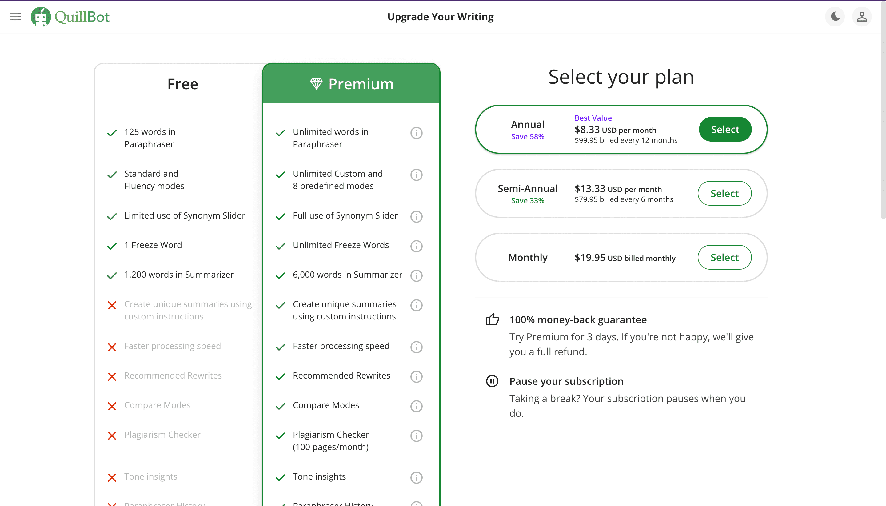 Quillbot and StealthGPT stand out as paraphrasing platforms tailored to diverse user requirements. Quillbot, starting at $19.95 per month, provides an unlimited word count for paraphrasing, while StealthGPT, with a starting price of $14.99 per month, offers a monthly quota of 100,000 words. It is essential to evaluate the unique features each platform brings to the table.