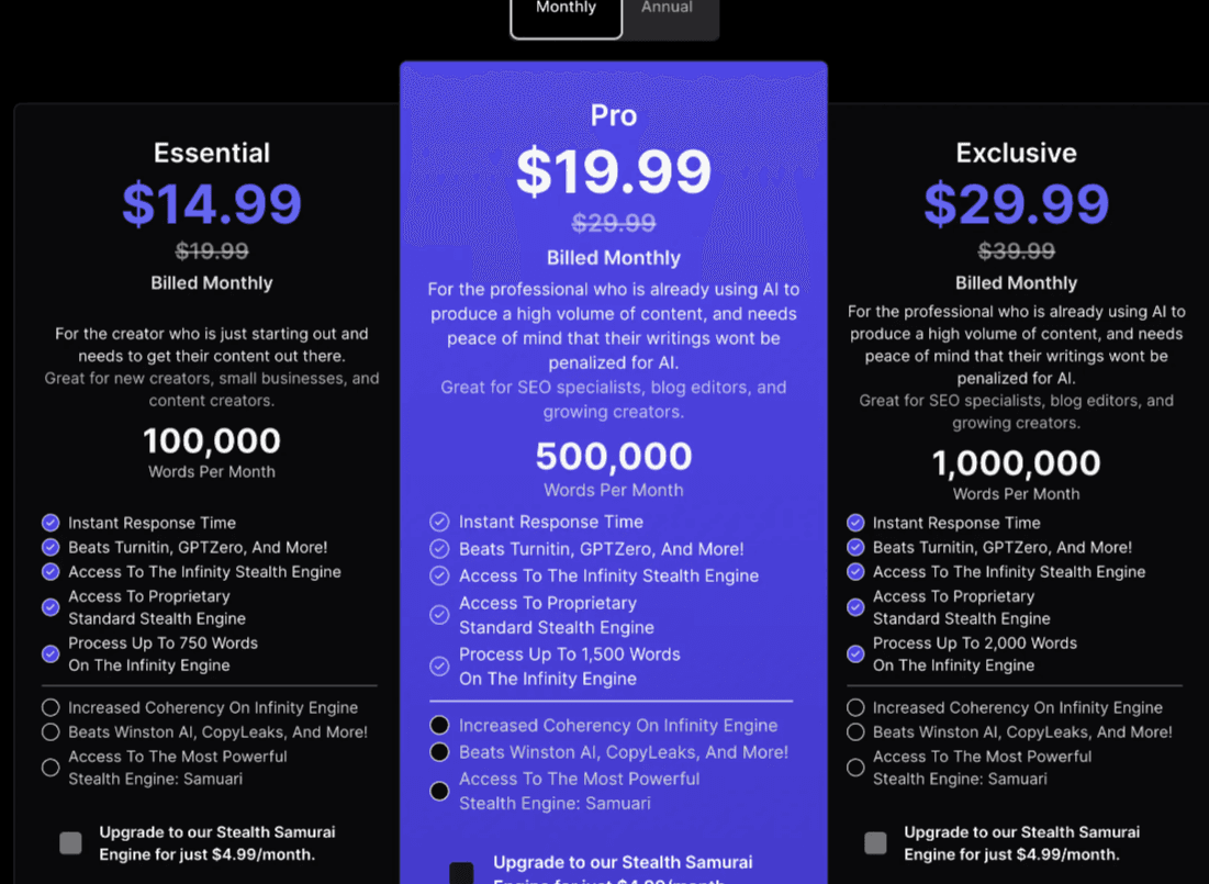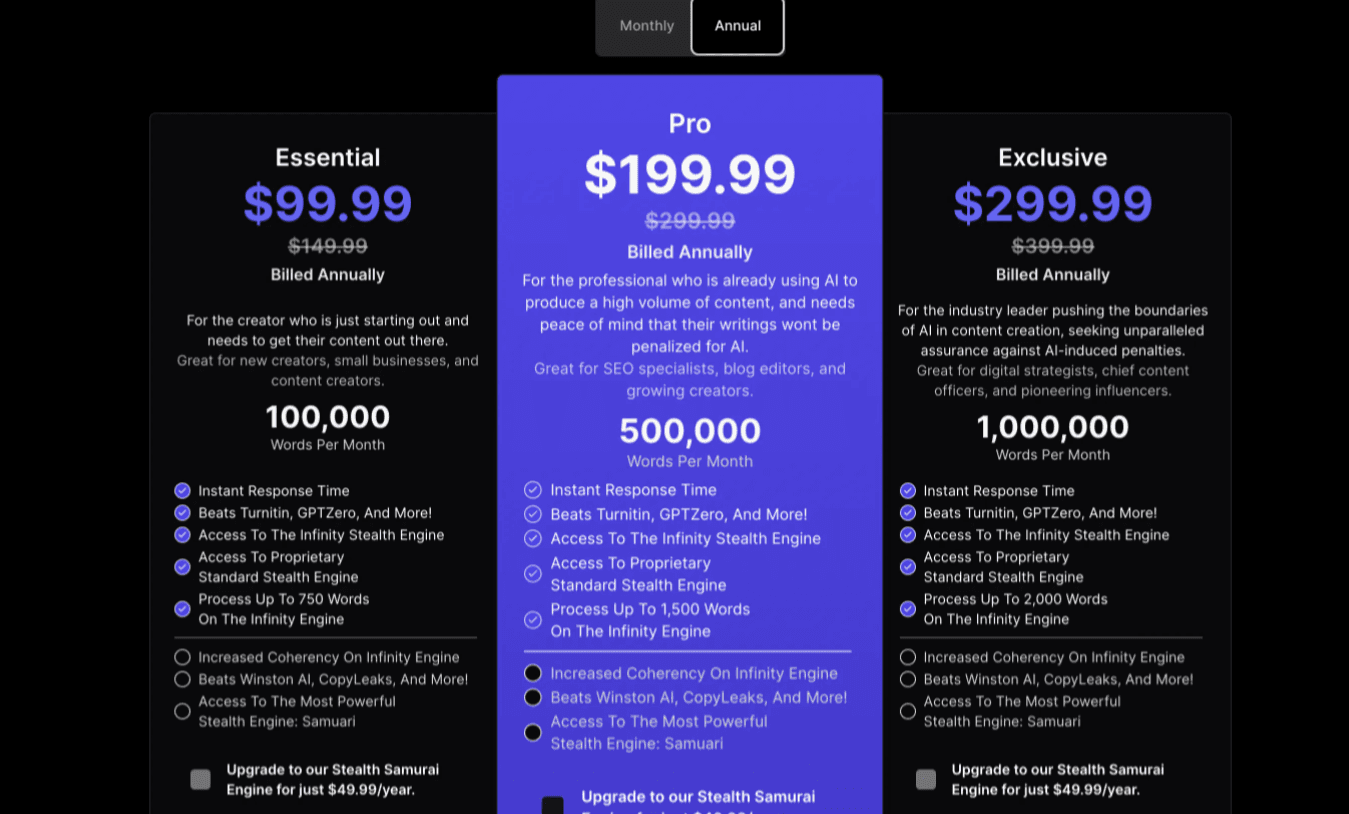 Starting at $14.99 per month for 100,000 Undetectable AI words, 1 user, and with chrome extension. $19.99 for 500,000 words per month and $29.99 for 1,000,000 words per month. An annual option of $99.99 for 100,000 words per month, $199.99 for 500,000 words per month, and $299.99 for 1,000,000 words per month. And the latest business option of $39.99 for 100,000 words per month, $49.99 for 2,500,000 words per month, and $99.99 for 15,000,000 words per month.