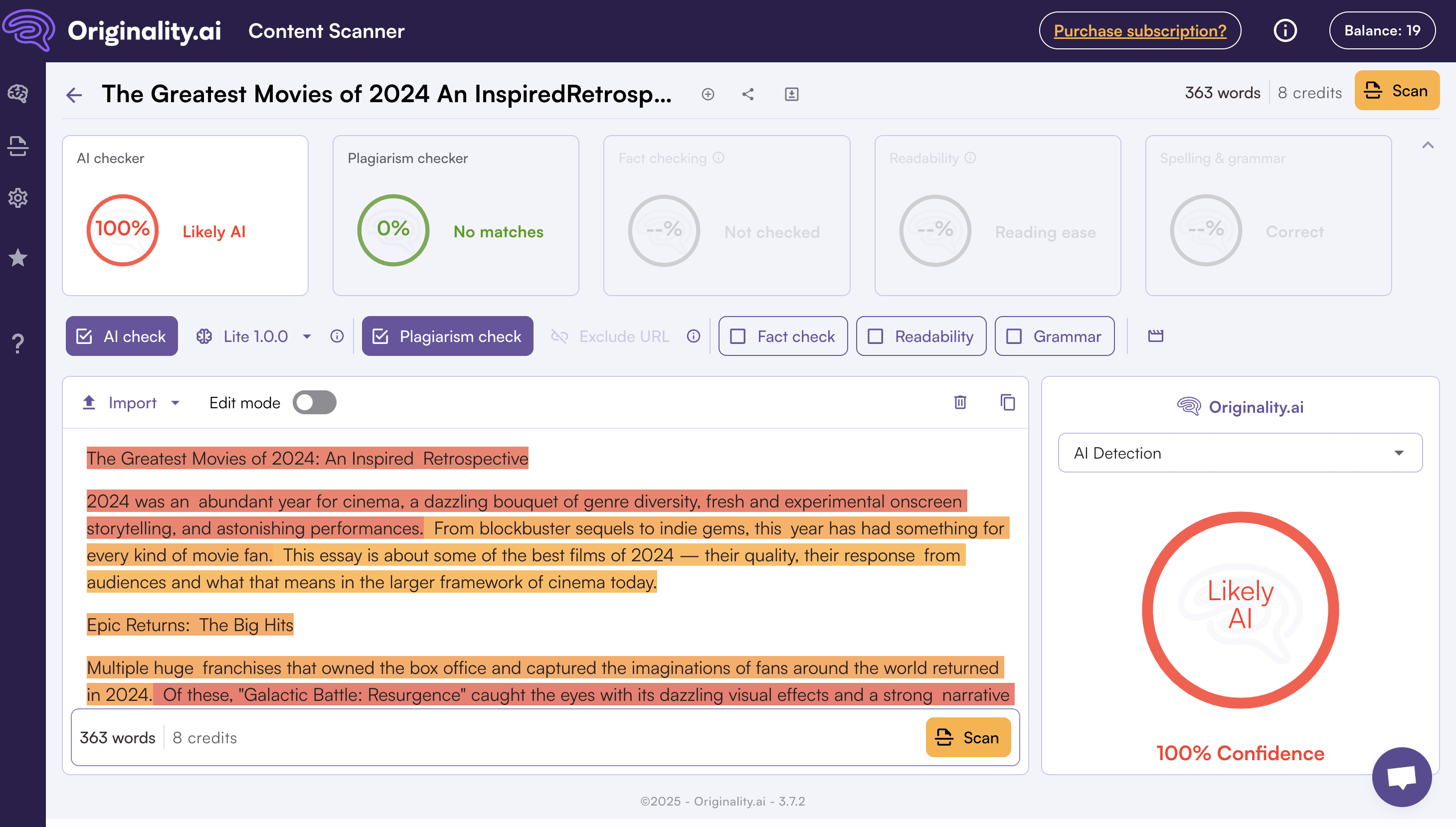 With an AI score of 100%, Originality AI saw right through Rewritify’s AI rewriter and determined the text was “Likely AI”.