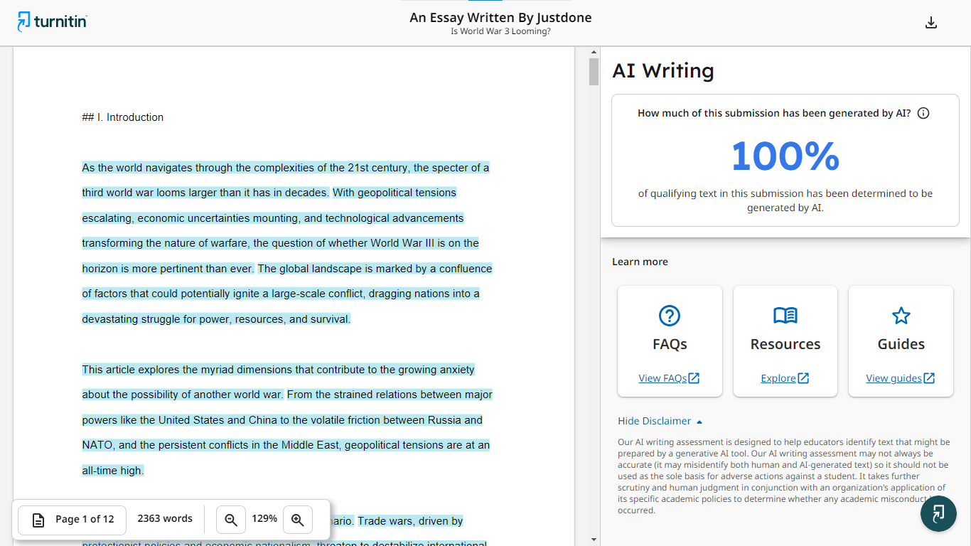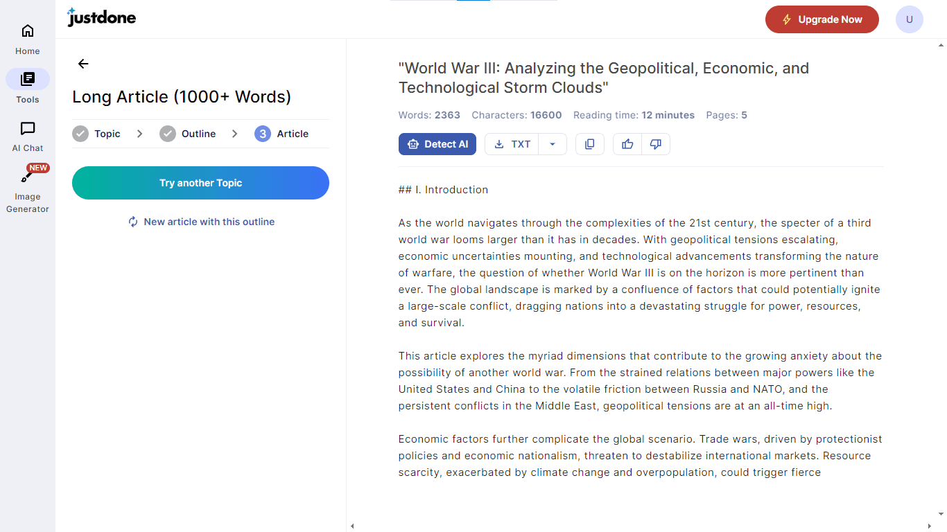 Some AI tools like Justdone claim to be the best in the business of writing academic essays. Justdone uses the GPT 4 language model. We were curious to see what Justdone could do, so we prompted it to write an essay on the topic “Is World War 3 Looming?”