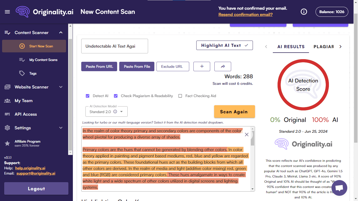 Yet again, Undetectable AI failed to bypass AI content detection. Originality.ai accurately guessed that there was a 100% chance that the input was AI-generated.