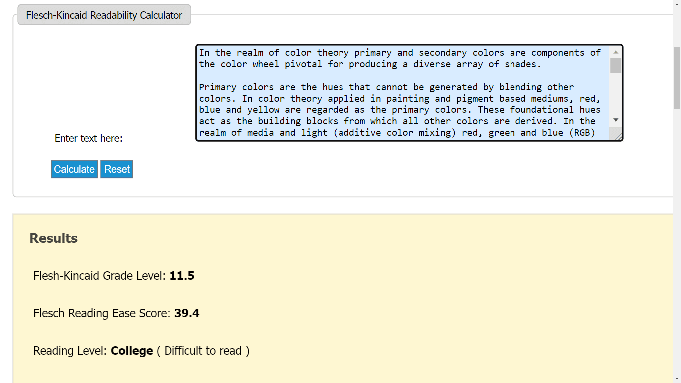 Our research shows that the readability of the text humanized with Undetectable AI is usually low. We checked the Undetectable AI’s content using a Flesch Kincaid calculator. Here's a screenshot of the content’s readability score: