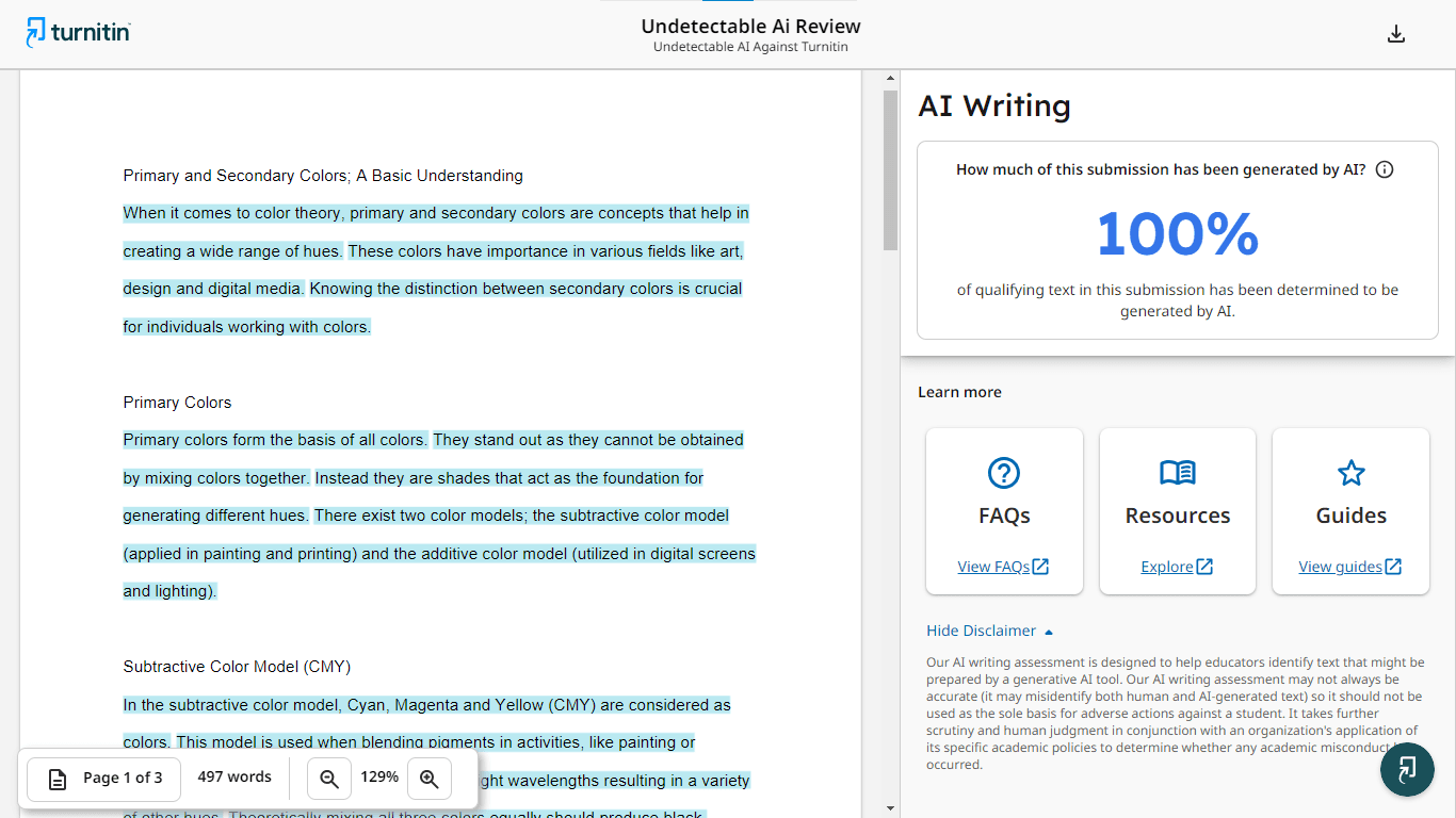 Turnitin rightly guessed that 100% of the text that Undetectable AI wrote was AI-generated.