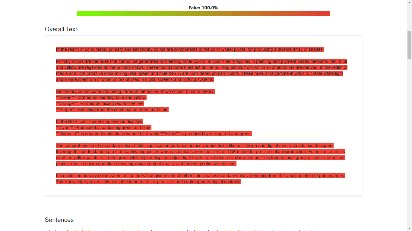 Sapling categorized the humanized text as 100% fake. This means that Sapling wasn't convinced that the humanized text was written by a human being.