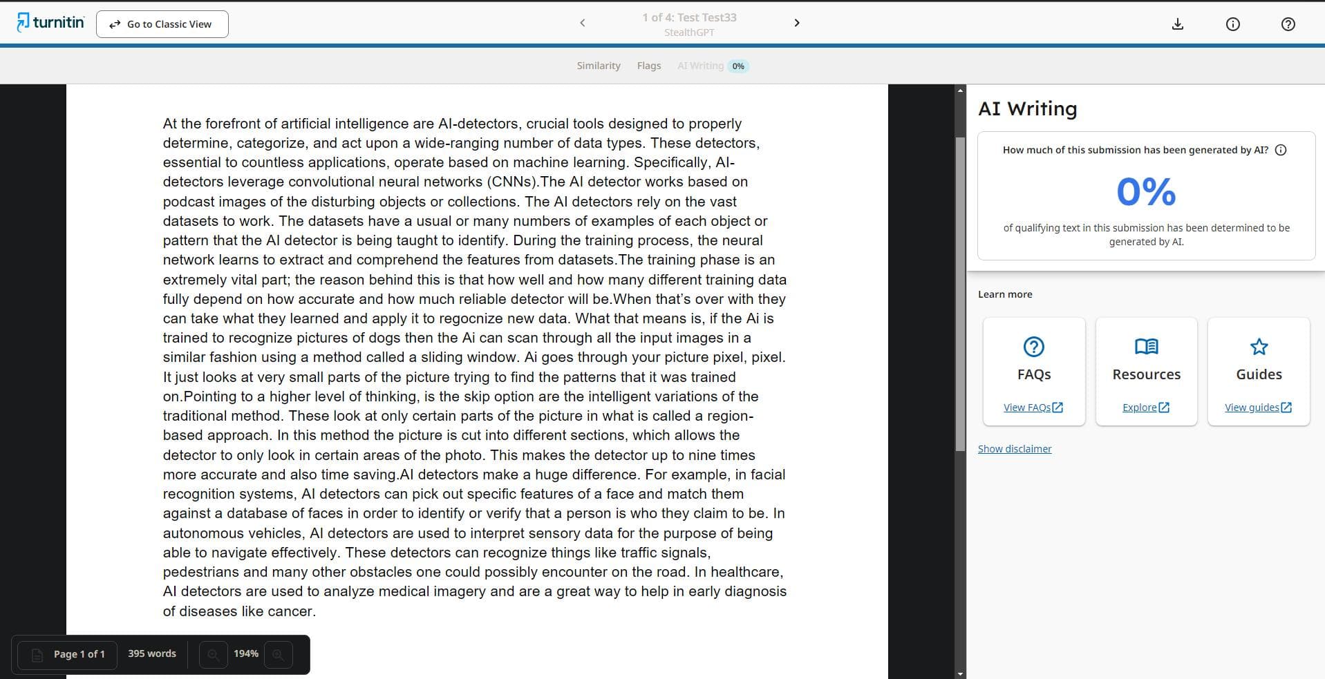 Popular AI detectors such as GPTZero, Originality, and TurnItIn will be used for this experiment. We will provide images showcasing how StealthGPT compares against WriteHuman.