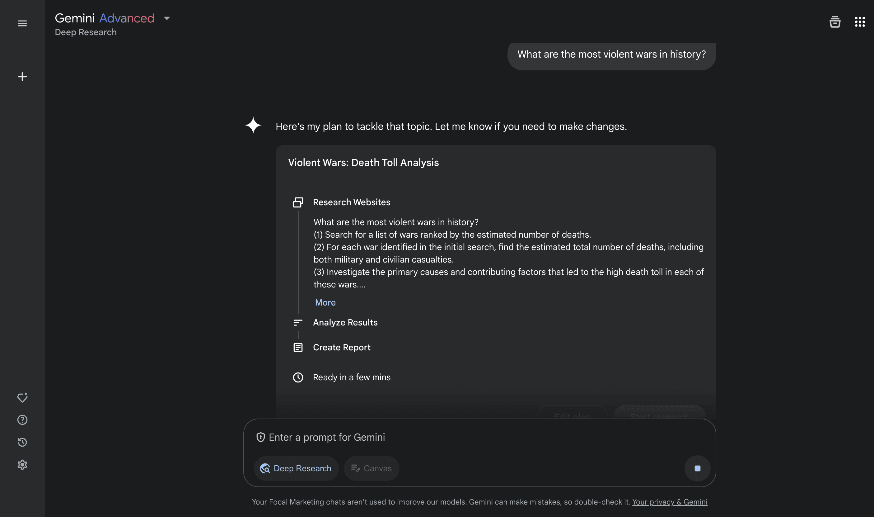 Now, input a prompt to the chatbot and see how Gemini generates a research plan for you to fine tune. You can then choose to edit the plan or start research.