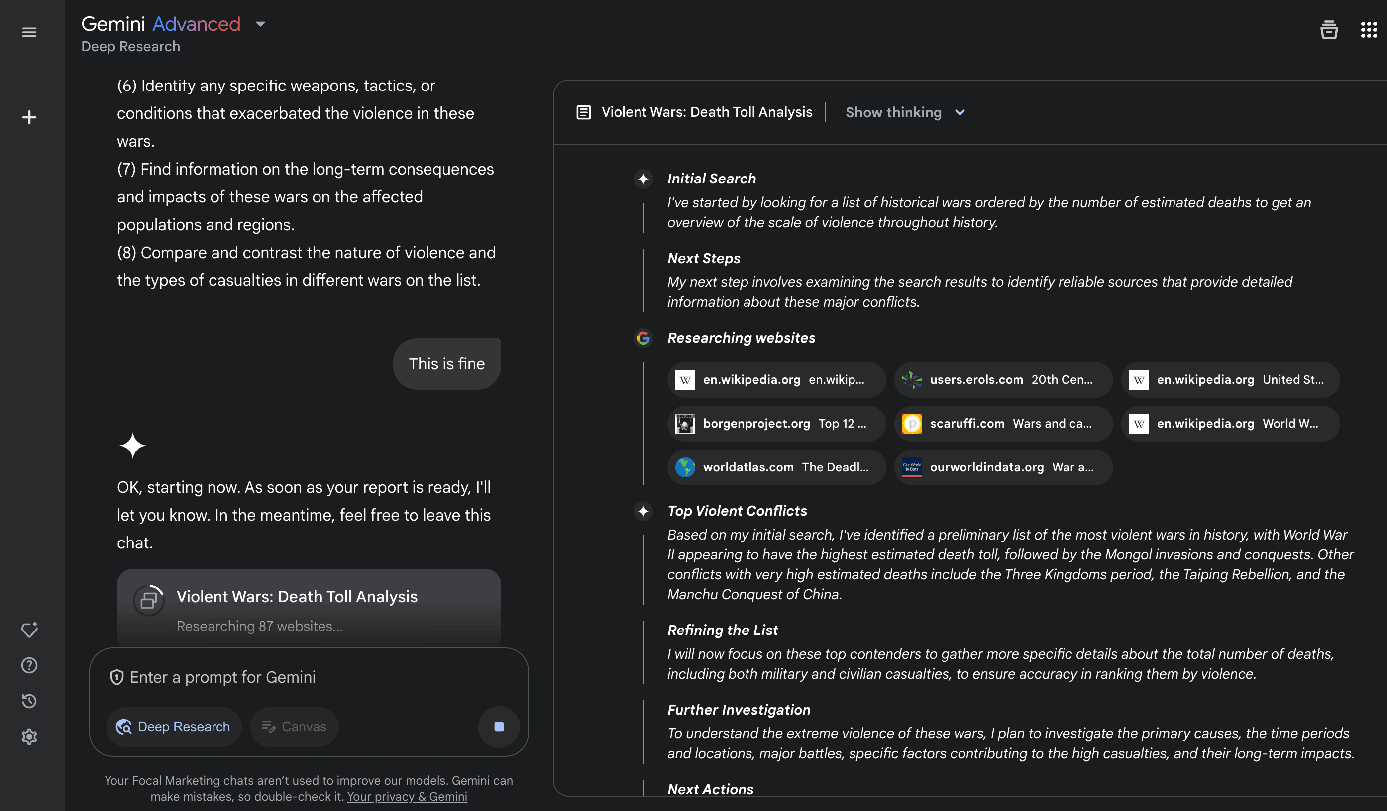 The first thing Gemini does when tasked with a new research project is formulate a research plan. By breaking down the search query into a number of sub-tasks that it presents to you, you can then choose which areas of research to focus on.