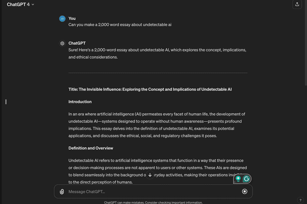 You can open any AI writing tool and send it a prompt. You can make your prompt as short or long as you desire. Here, I just want to keep it simple for you to visualize, so I will ask ChatGPT to give me a 2000-word essay about undetectable AI.