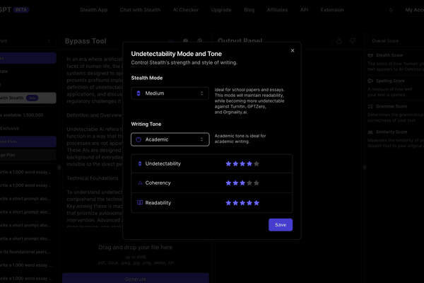 The tone you choose here should align with the format of the AI-written content. Regarding the 2000-word essay ChatGPT generated for us in the first step, I will set the undetectability tone to "academic," which is ideal for the academic writing.